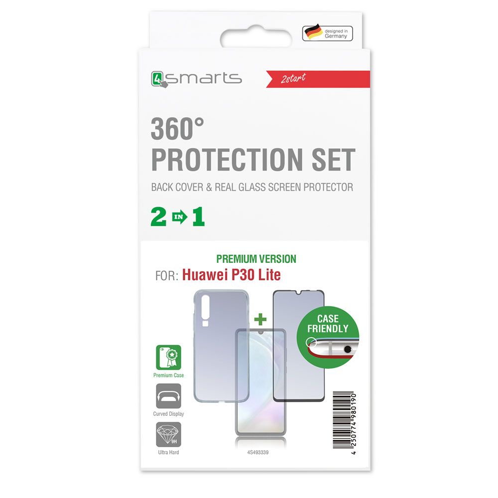 4smarts 360° Case Friendly Premium Protection Set - тънък силиконов кейс и стъклено защитно покритие за дисплея на Huawei P30 Lite (прозрачен)