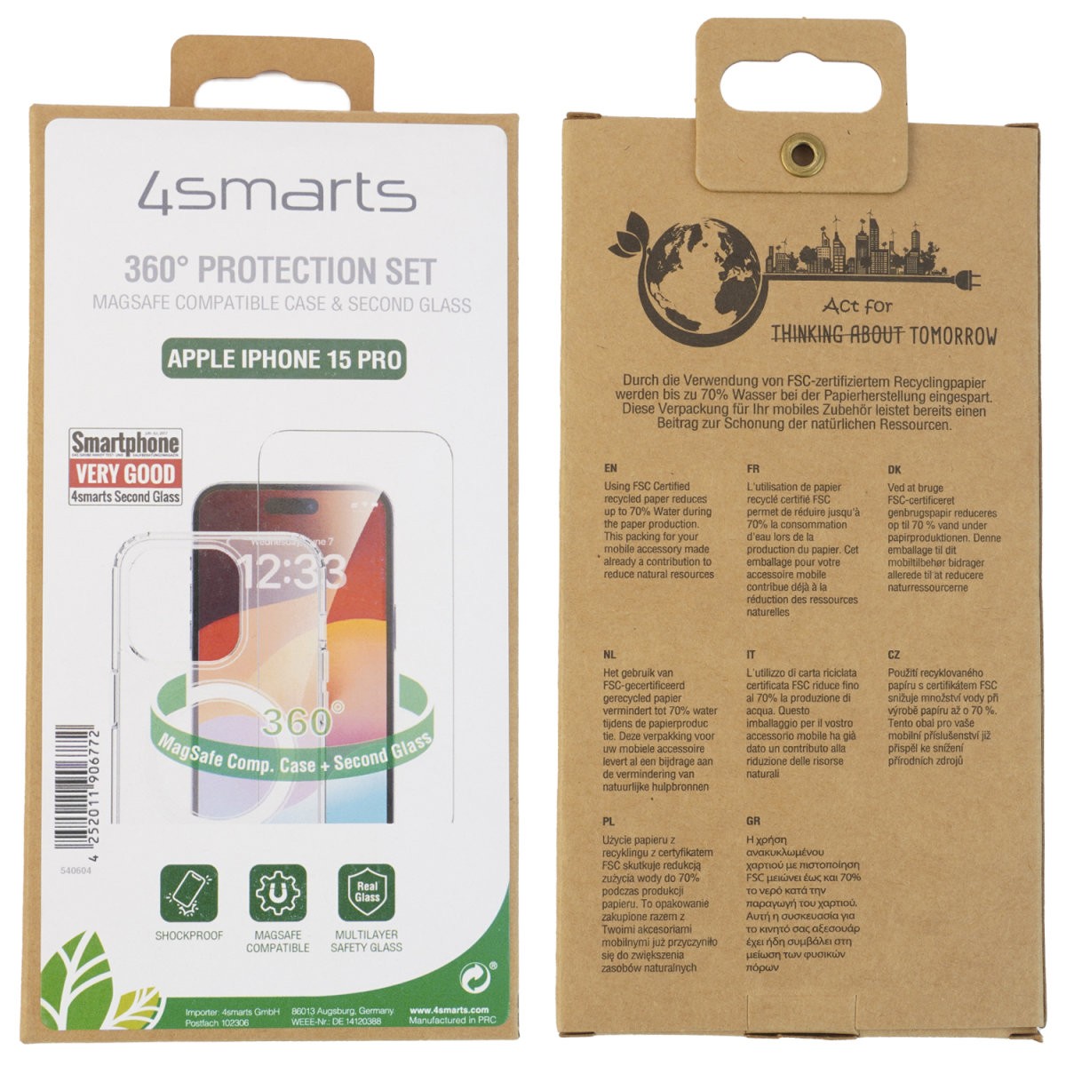 4smarts 360° Premium Protection Set - хибриден удароустойчив кейс с MagSafe и стъклено защитно покритие за дисплея на iPhone 15 Pro (прозрачен)