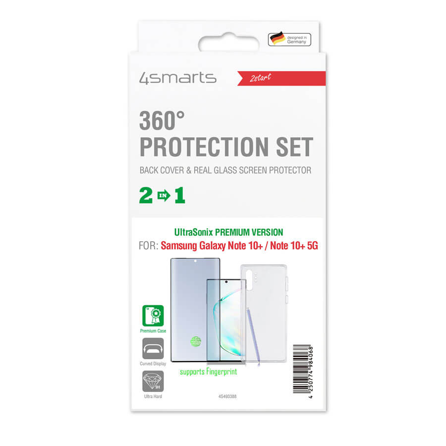 4smarts 360° Premium Protection Set UltraSonix - тънък силиконов кейс и стъклено защитно покритие за дисплея на Samusg Galaxy Note 10 Plus, Note 10 Plus 5G (прозрачен)