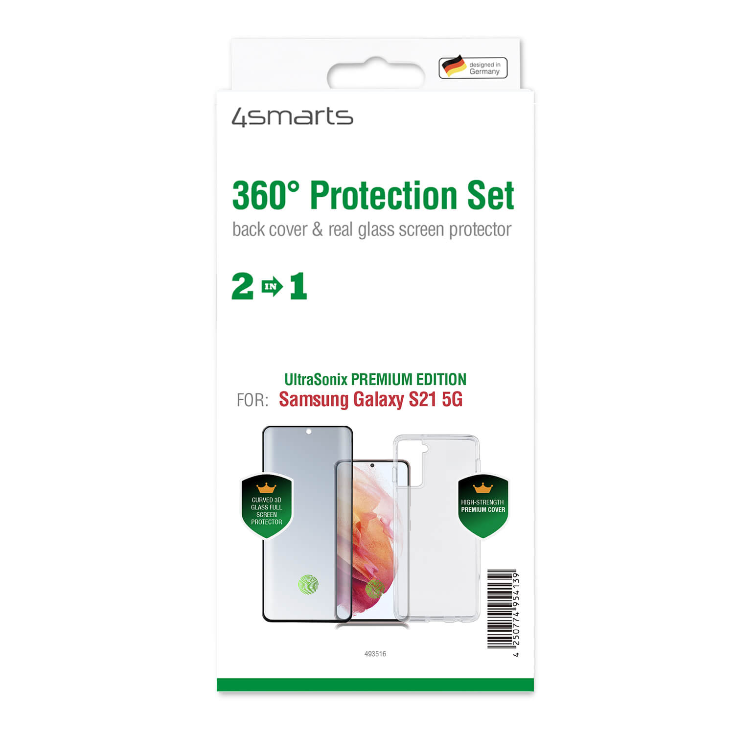 4smarts 360° Premium Protection Set UltraSonix - тънък силиконов кейс и стъклено защитно покритие за дисплея на Samusg Galaxy S21 (прозрачен)