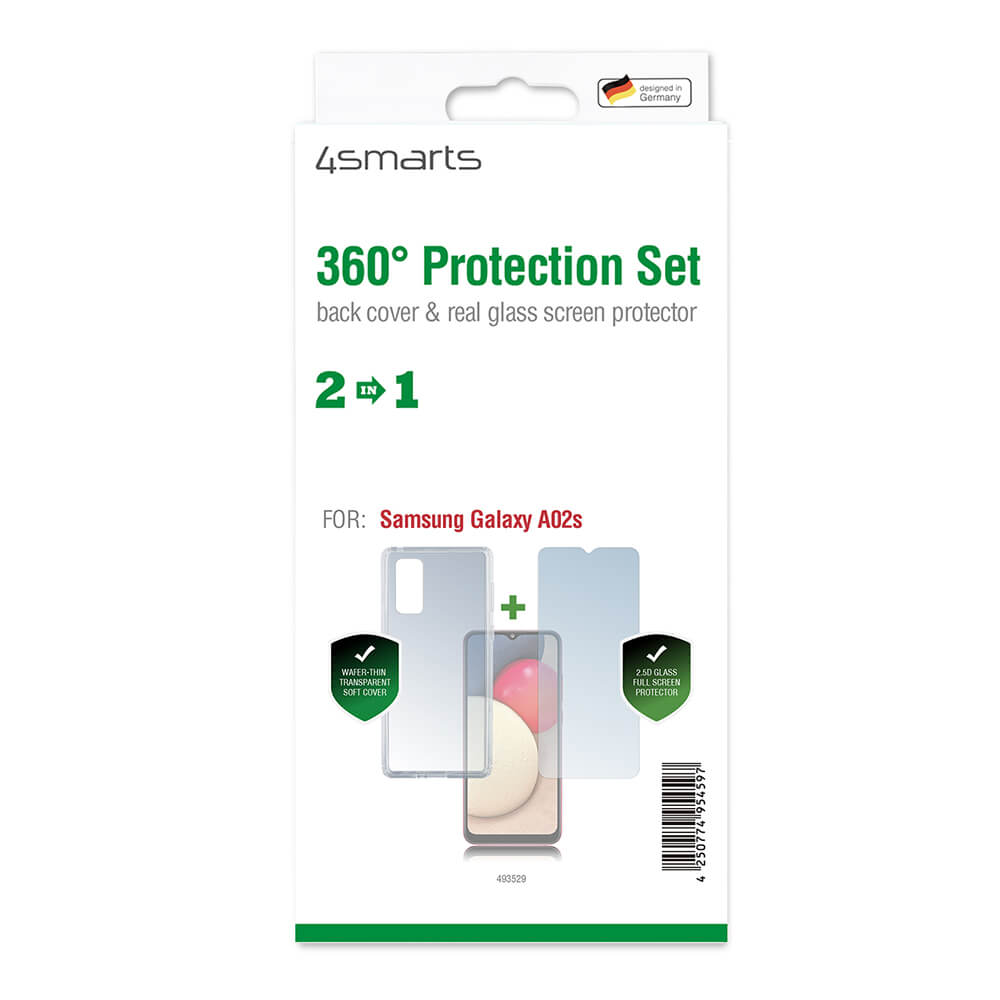 4smarts 360° Protection Set Limited Cover - тънък силиконов кейс и стъклено защитно покритие за дисплея на Samsung Galaxy A02s (прозрачен)