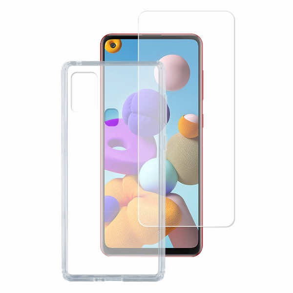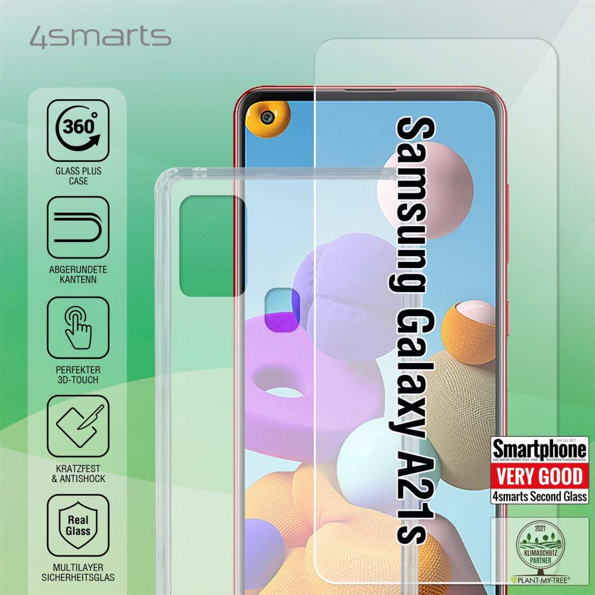 4smarts 360° Starter Set X-Pro Glass - тънък силиконов кейс и стъклено защитно покритие за дисплея на Samsung Galaxy A21s (прозрачен)