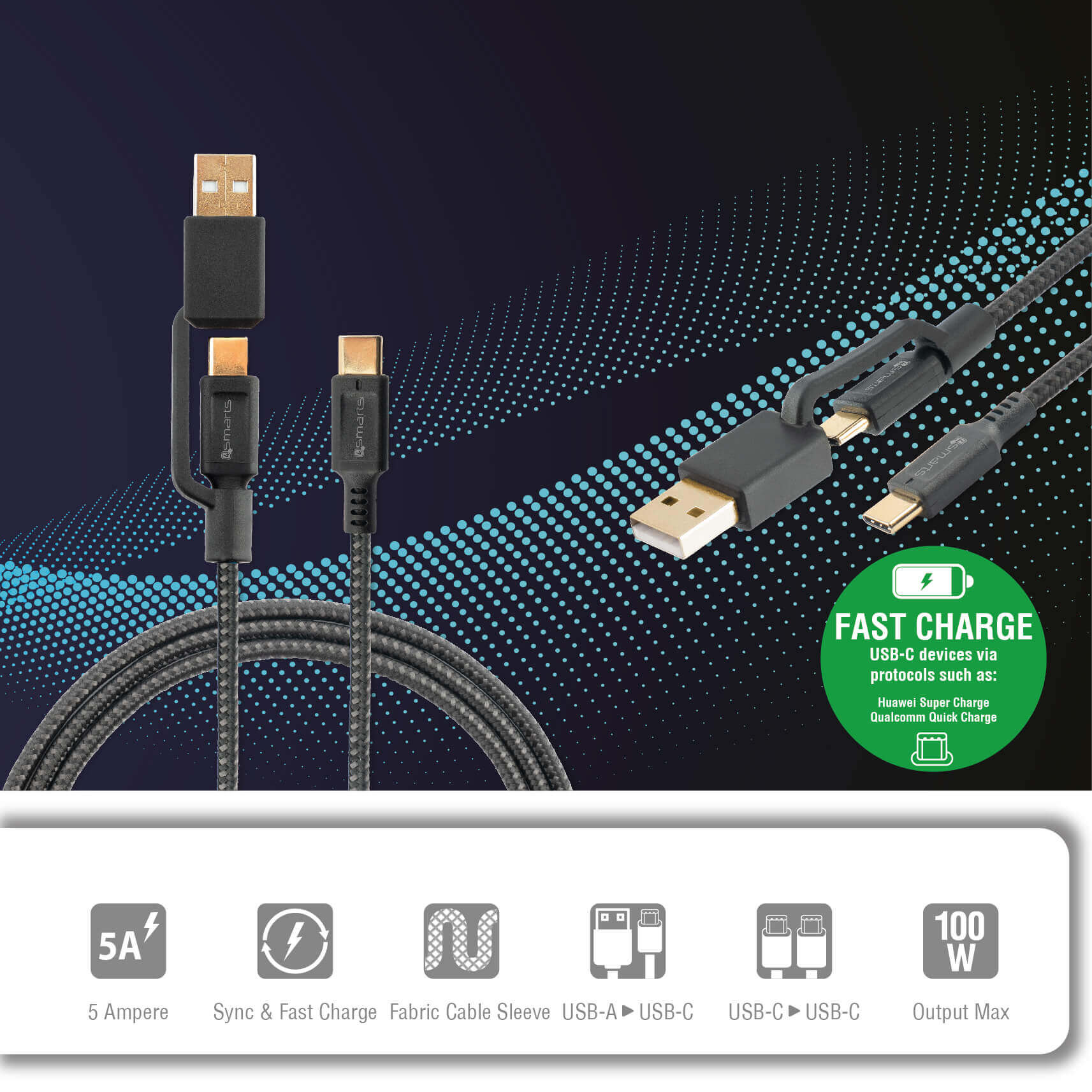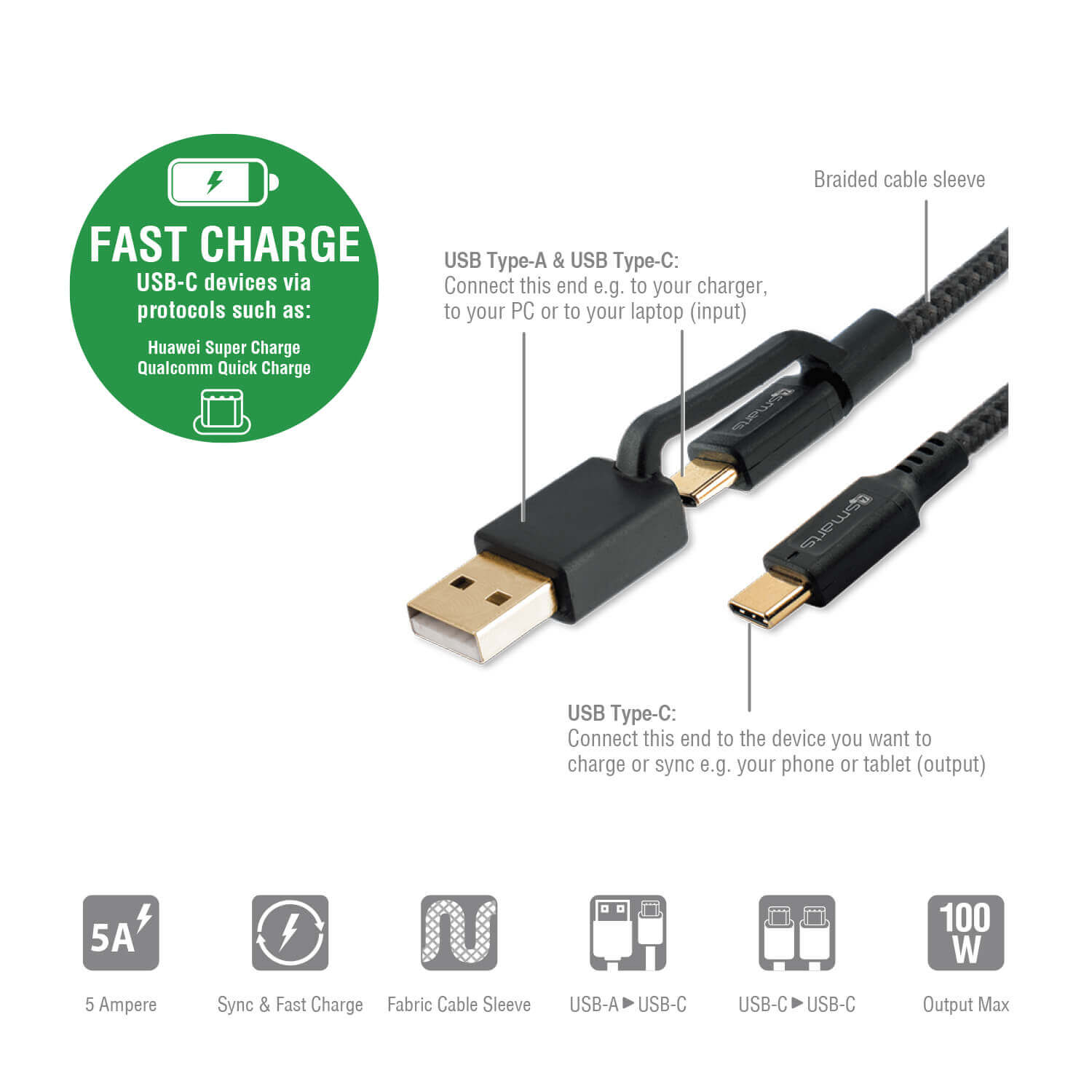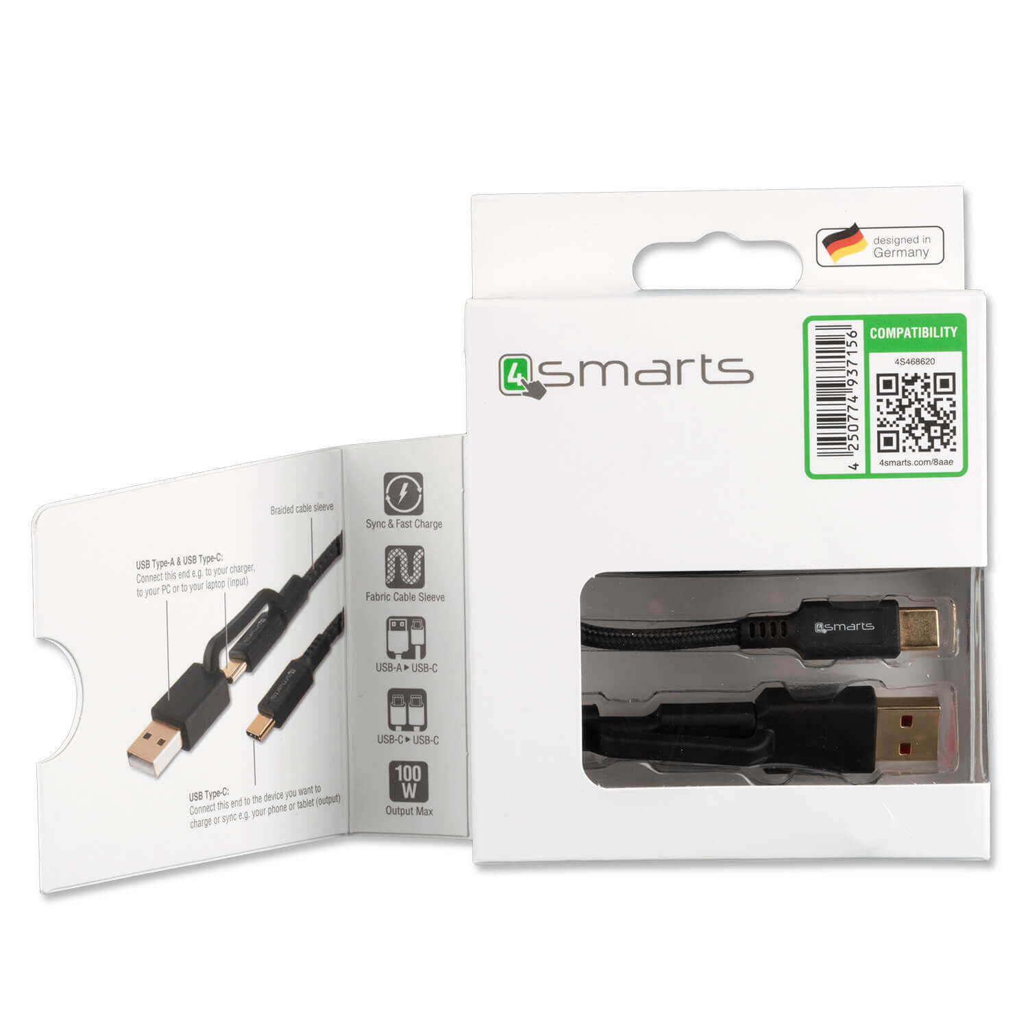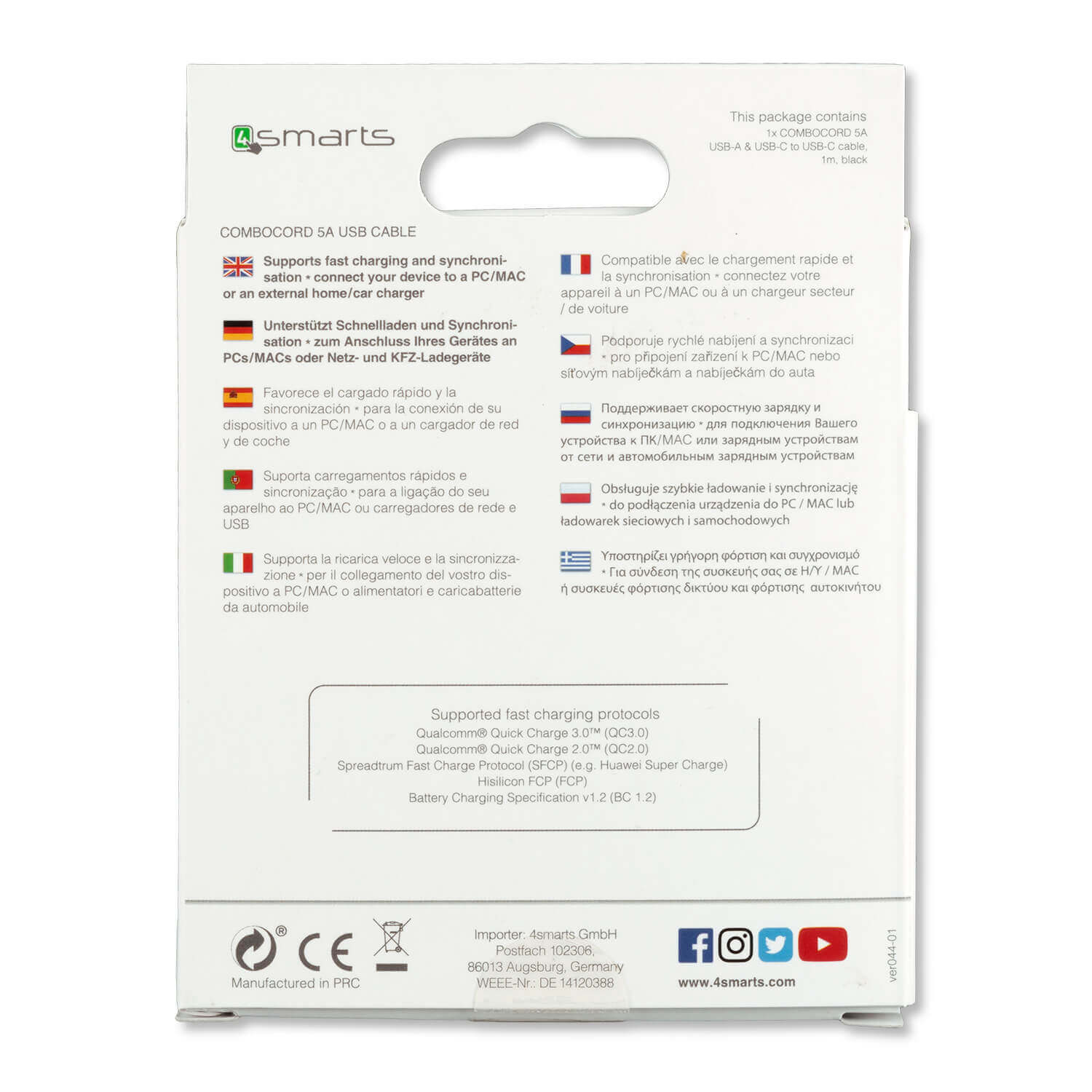 4smarts ComboCord 5A USB-A and USB-C to USB-C - качествен многофункционален кабел за USB към USB-C и USB-C към USB-C (черен)