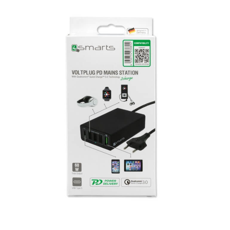 4smarts Mains Charging Station VoltPlug Power Delivery & QC3.0 60W - захранване с 4хUSB изхода и USB-C изход (черен)