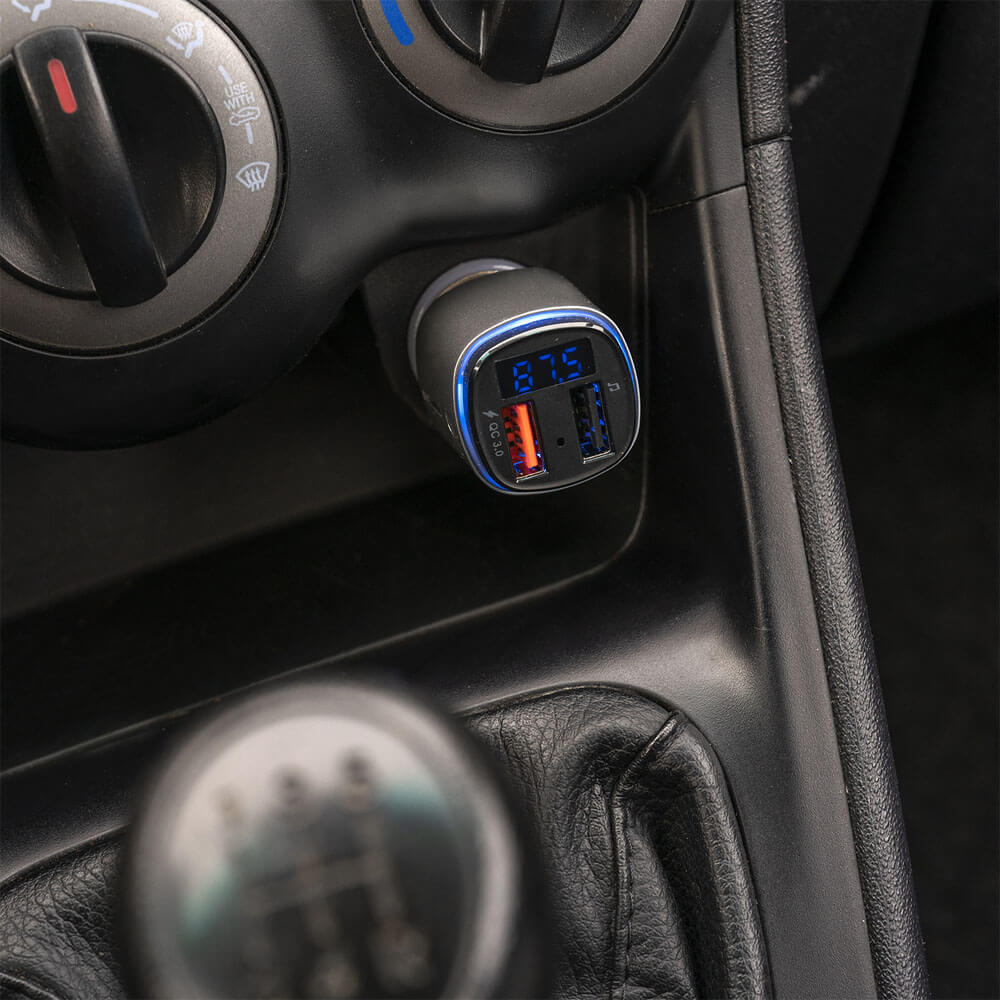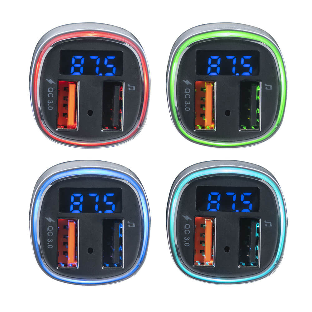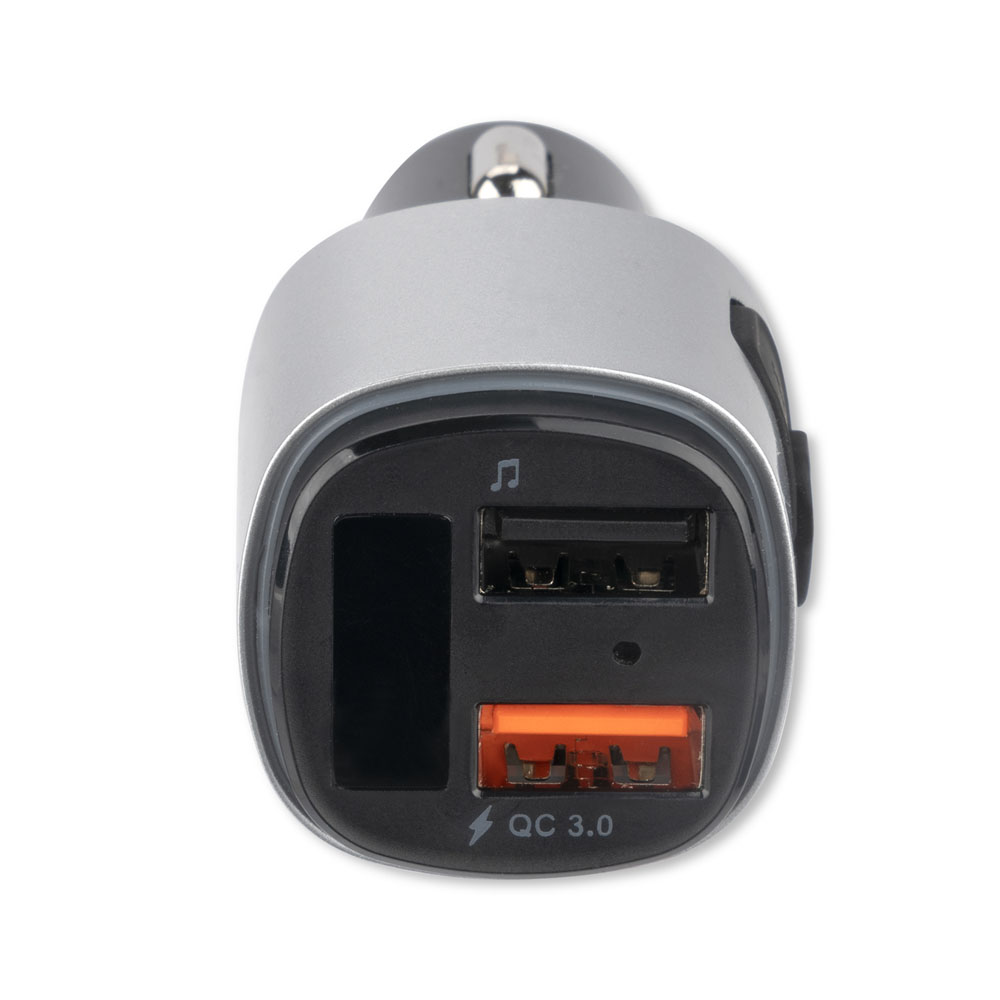 - USB порт с технология за бързо зареждане - Възможност да зареждате две мобилни устройства едновременно - LED светлина с възможност за променяне на цвета - Дисплей - Максимален рейндж: 10 м. - Вход: 12-24V - 1 USB (quick charge) - DC 3.6-6.5V/3.1A; 6.5-9V/2A; 9-12V/1.5A - 2 USB (media port) - DC 5V/1A - USB (media port) поддържа: MP3, WMA, WAV, FLAC, APE - MicroSD card поддържа: MP3, WMA, WAV, FLAC, APE - Честотен диапазон на трансмитера: 87.5 - 108.0 MHz - Размери: 3 х 3 х 8 см.
