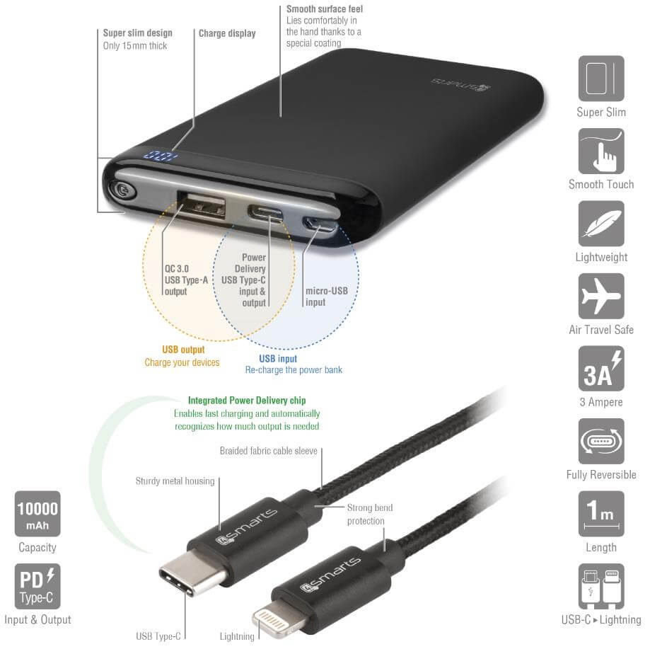 4smarts Power Bank VoltHub 10000 mAh PD and QQC 3.0 - външна батерия с два USB и USB-C изходи и технология за бързо зареждане и Lightning към USB-C кабел (черен)