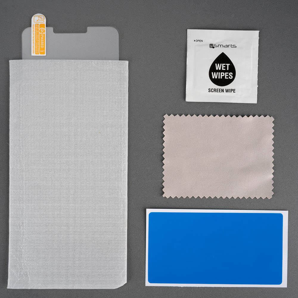 - 1 х 4smart Tempered Glass Protector - 1 x микрофибърна кърпичка - 1 х мокра кърпичка - 1 х антистатична лепенка за премахване на прашинки