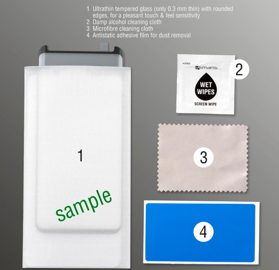 - 1 х 4smart Tempered Glass Curved Protector - 1 x микрофибърна кърпичка - 1 х мокра кърпичка - 1 х антистатична лепенка за премахване на прашинки
