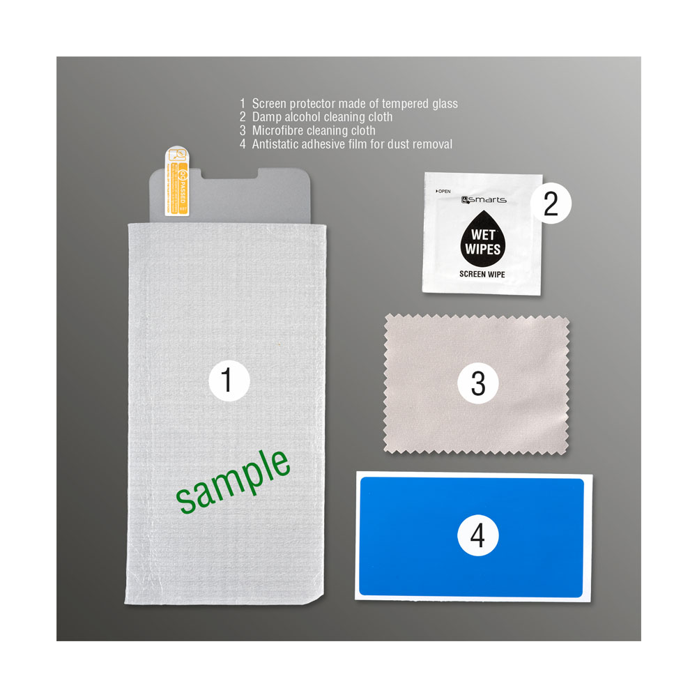 - 1 х 4smart Tempered Glass Protector - 1 x микрофибърна кърпичка - 1 х мокра кърпичка - 1 х антистатична лепенка за премахване на прашинки