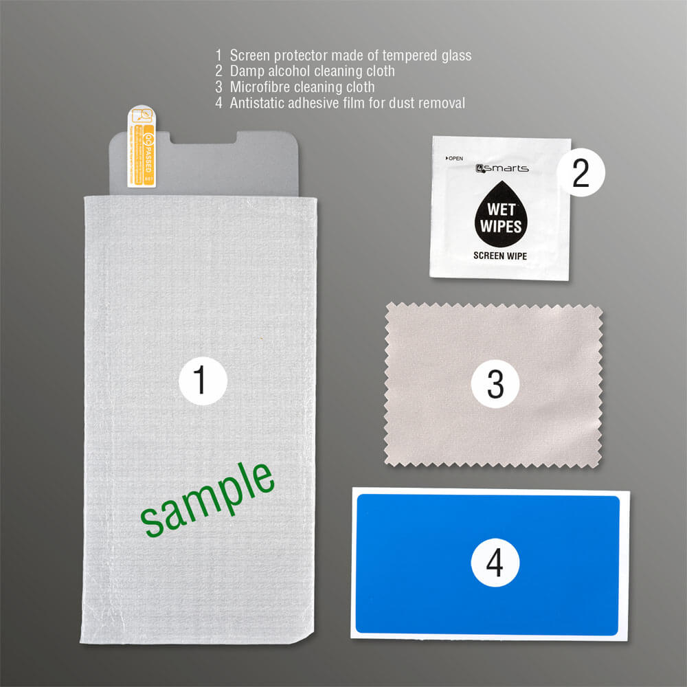 - 1 х 4smart Tempered Glass Protector - 1 x микрофибърна кърпичка - 1 х мокра кърпичка - 1 х антистатична лепенка за премахване на прашинки