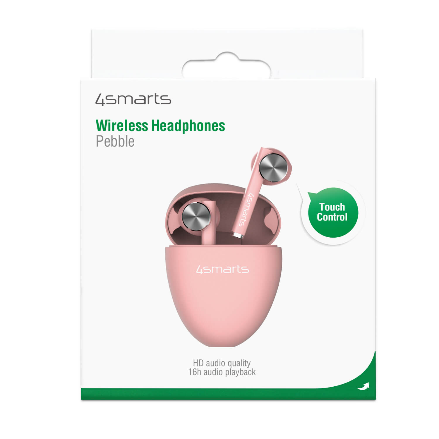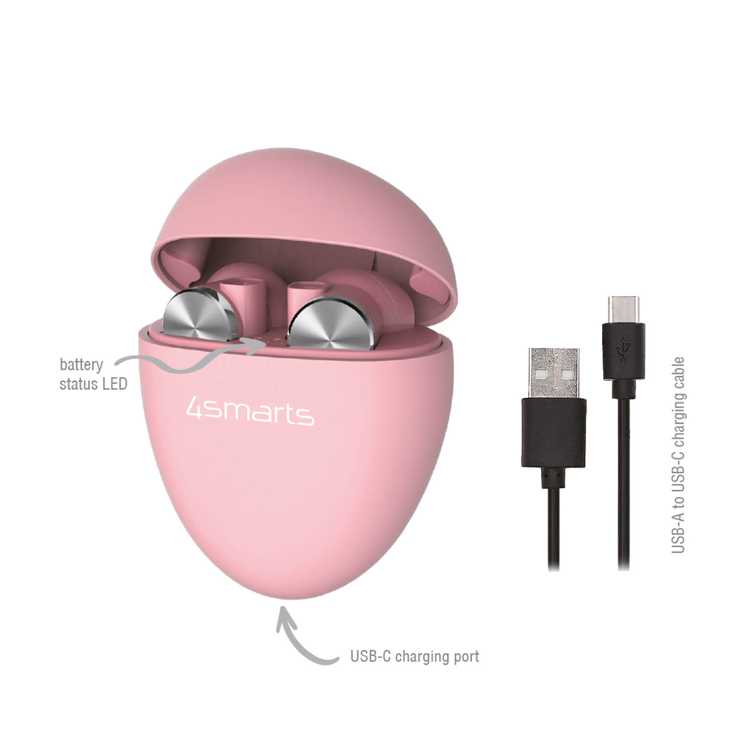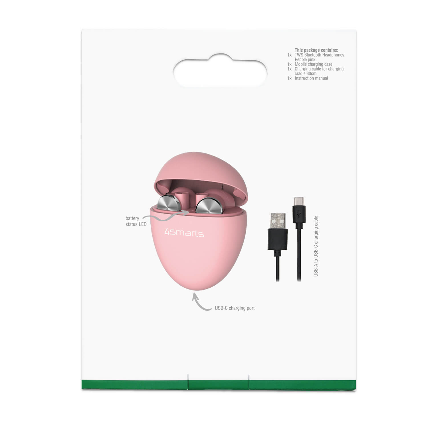 - 4smarts TWS Bluetooth слушалки Pebble - Кейс за зареждане на слушалките - Кабел за зареждане на кейса USB-A към USB-C (30см) - Ръководство