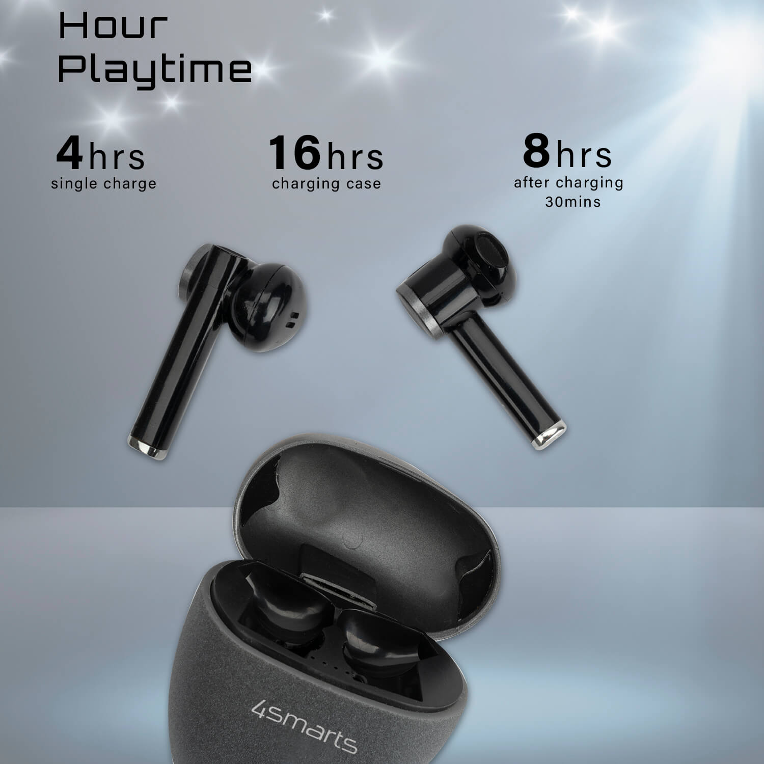 - Слушалките сами по себе си ще ви осигурят около 4 часа музика, а компактният кейс за зареждане удължава времето на работа до 16 часа
