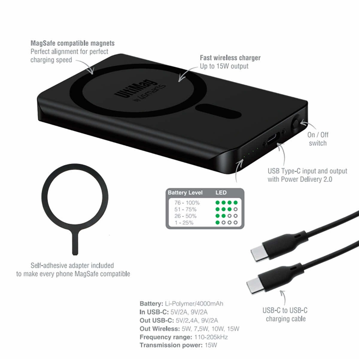 4smarts Wireless Power Bank VoltHub UltiMag 4000mAh for MagSafe - безжична преносима външна батерия с USB-C порт за iPhone с Magsafe (черен)