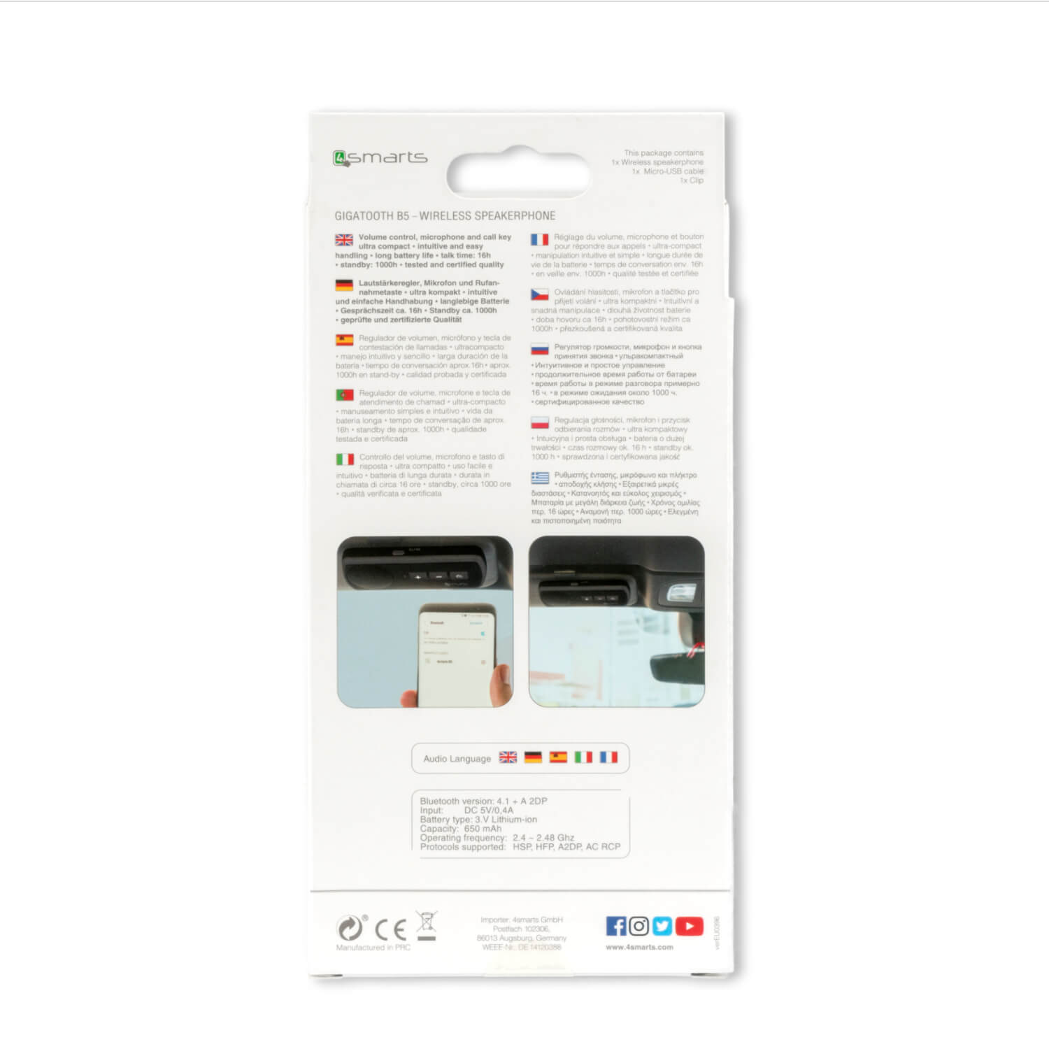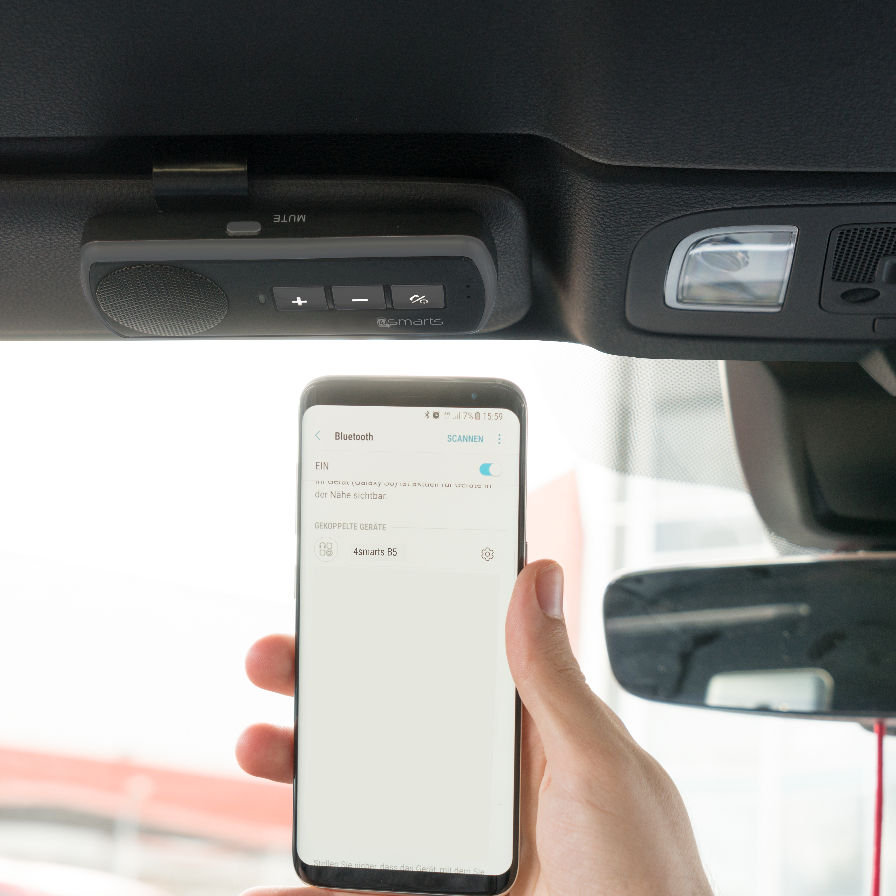 - Спийкърфон, който може лесно да бъде прикрепен към сенника на автомобила