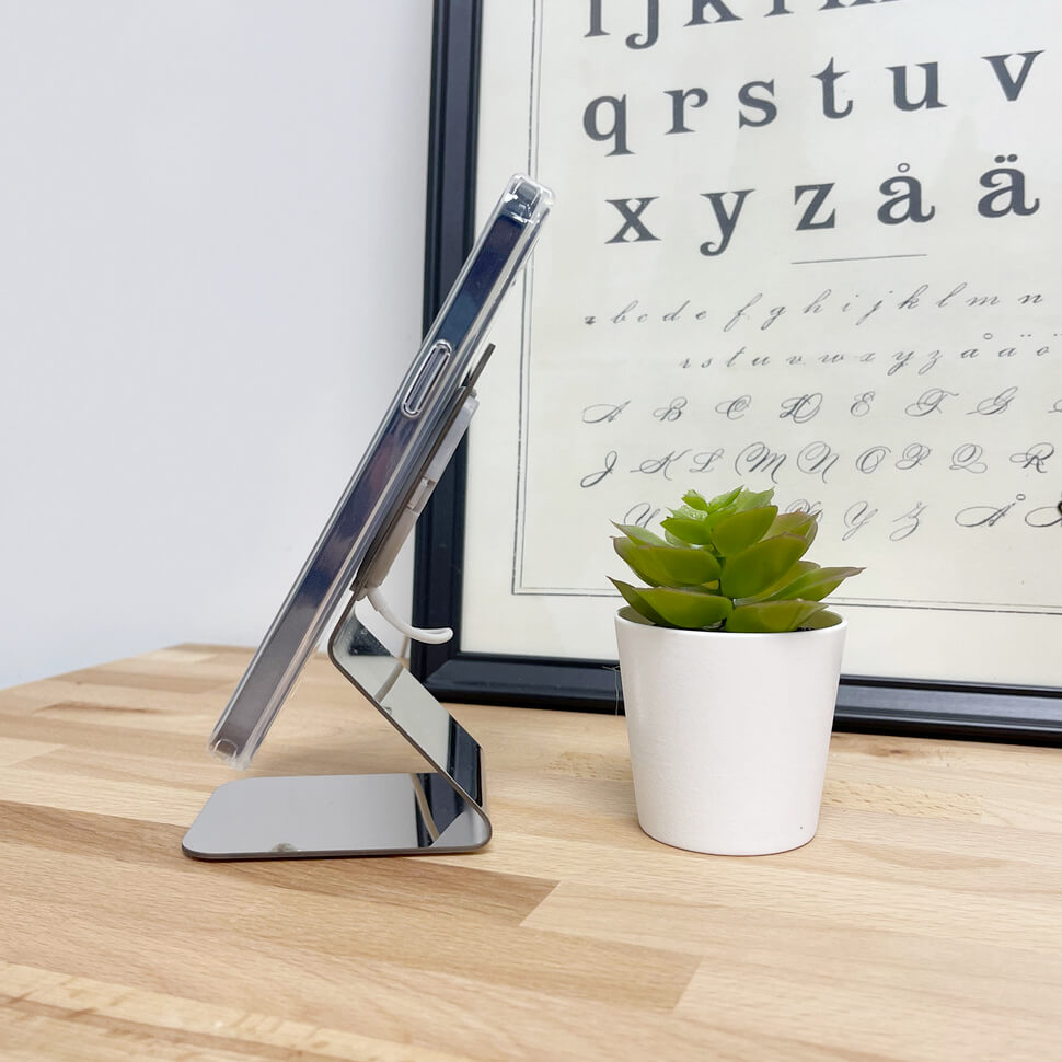 Представяме ви изключително здрава и лека алуминиева поставка за зареждане, създадена от Macally, идеална за вашето бюро, нощно шкафче или плот. Тази поставка не само че повдига вашия iPhone до удобно за очите ниво, но и предлага множество предимства при зареждане.
