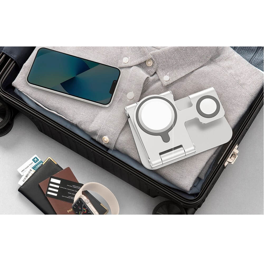 Алуминиева сгъваема поставка за зареждане на iPhone и Apple Watch, съвместима с Magsafe захранване и Apple Watch кабел - Omoton Aluminum MagSafe And Apple Watch Charging Stand (сив)