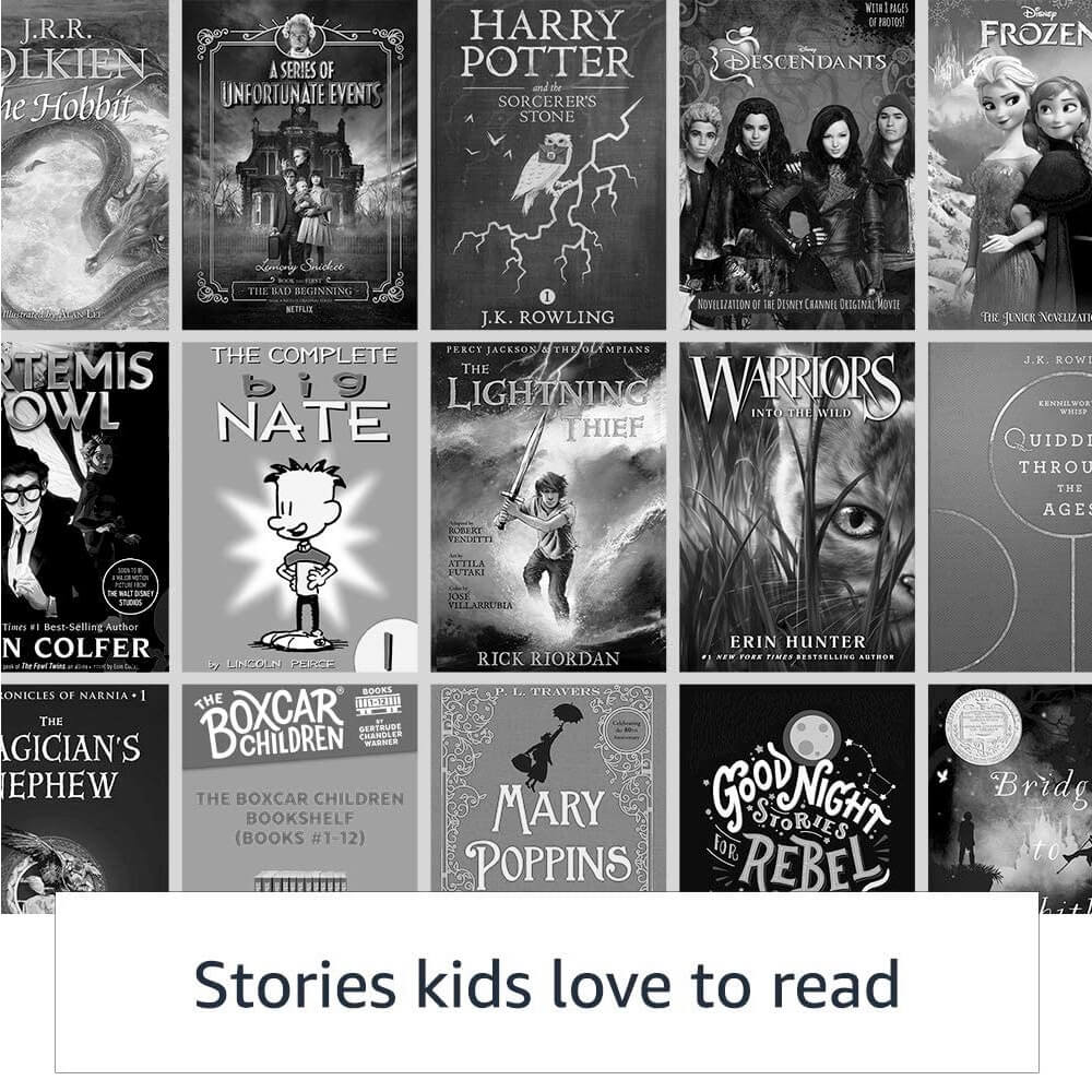- Amazon Kids+ включва пълната поредица за Хари Потър и първата книга от други популярни поредици като Artemis Fowl. Родителите могат да закупят допълнителни заглавия от Kindle Store