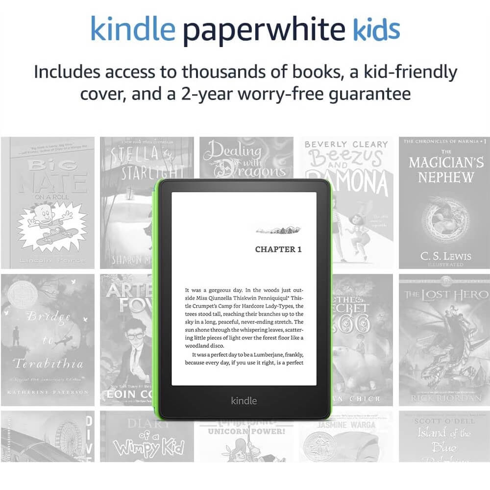 - Kindle Paperwhite Kids е специално създаден за четене (не е играчка), с по-голям черно-бял 6,8” 300 ppi дисплей без отблясъци и до 10 седмици живот на батерията
