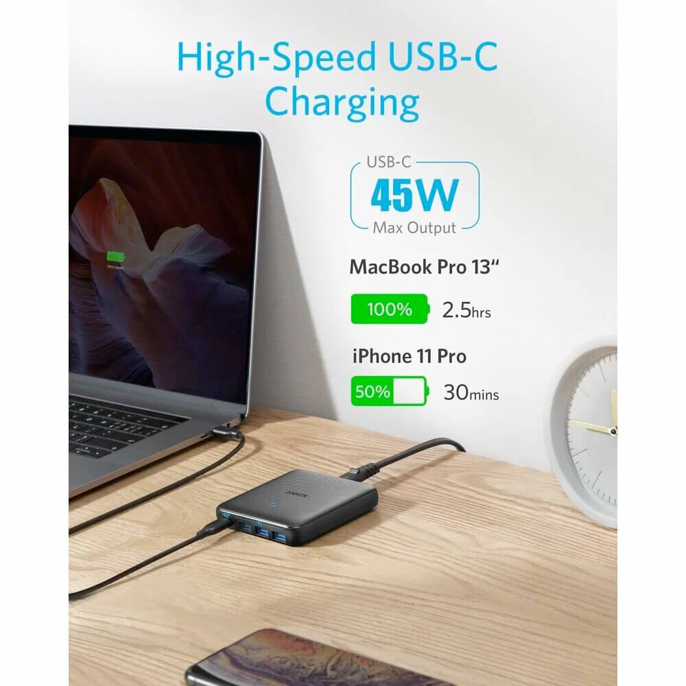 - Възможност за зареждане и на MacBook с мощност до 45W чрез единия USB-C порт
