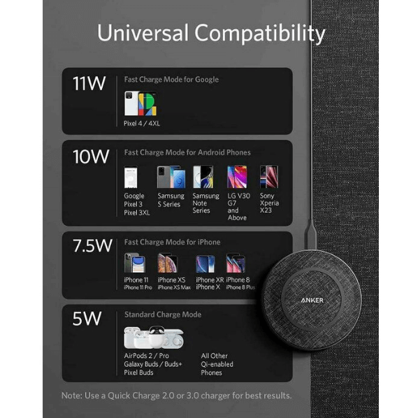 - PowerWave е оборудвана с 11W, 10W, 7.5W и 5W режими на зареждане, осигурявайки безупречна съвместимост с Google Pixel, Samsung, iPhone и всички други устройства, поддържащи Qi