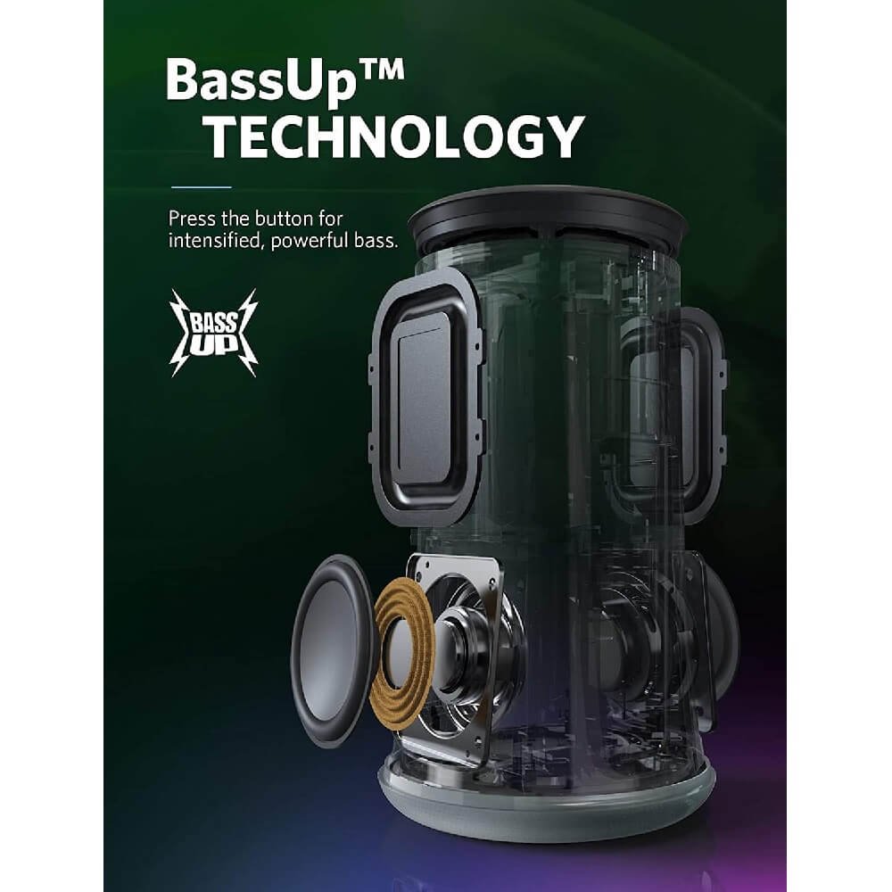 - С технологията BassUp™ персонализиран процесор първо анализира, след това подобрява басовите честоти на вашата музика в реално време. Този аудио сигнал се превръща в звук чрез най-съвременните неодимови говорители. Просто натиснете бутона BassUp и се наслаждавайте