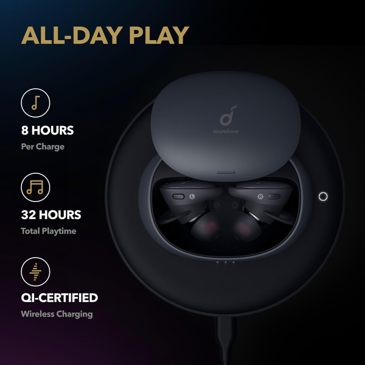 - С едно зареждане на слушалките ще можете да се насладите до 8 часа музика, а чрез презареждащия кейс, можете да си осигурите още 3 допълнителни зареждания