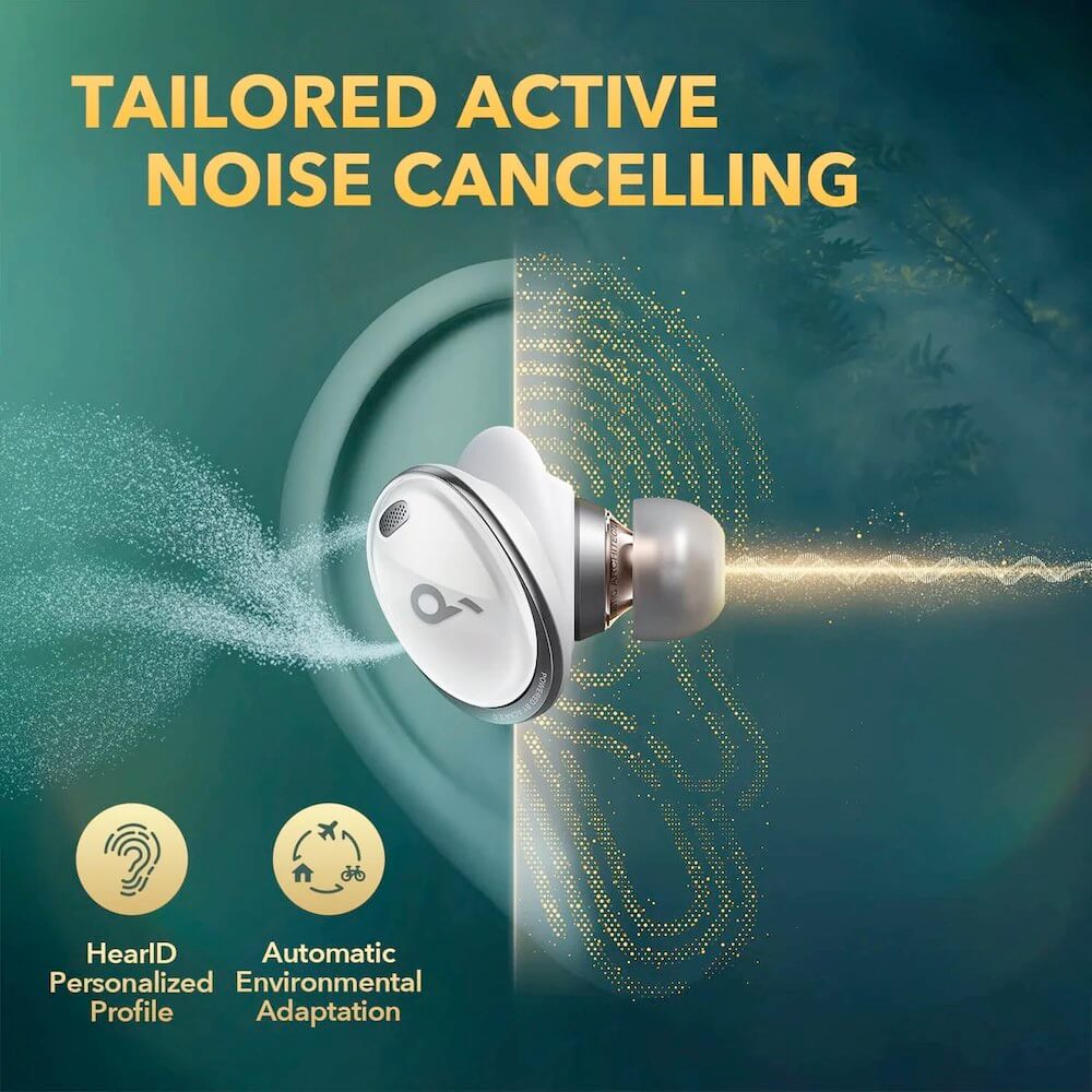 - HearID ANC е активно шумопотискане, което не само се приспособява към нивата на шума около вас, но и към ушите ви. Технологията HearID изучава начина, по който звукът се движи в ушите ви, както и нивото на налягане в ушите. След това създава персонализиран профил, който оптимизира намаляването на шума за вас, вашите уши и заобикалящата ви среда (настройването става чрез приложението Soundcore)