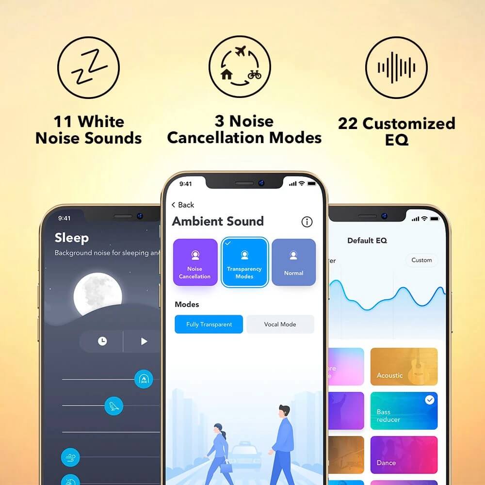 - 2 микрофона на всяка слушалка откриват и филтрират разсейващи шумове в близост до вас. Превключвайте между режими на транспорт, на открито и на закрито за персонализирано изживяване при шумопотискане.