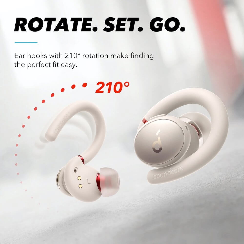 - Завъртете въртящите се на 210° кукички за уши, докато намерите идеалнота позиция за вас. Уникалният дизайн поддържа слушалките на удобно и сигурно на място по време и на най-интензивната тренировка