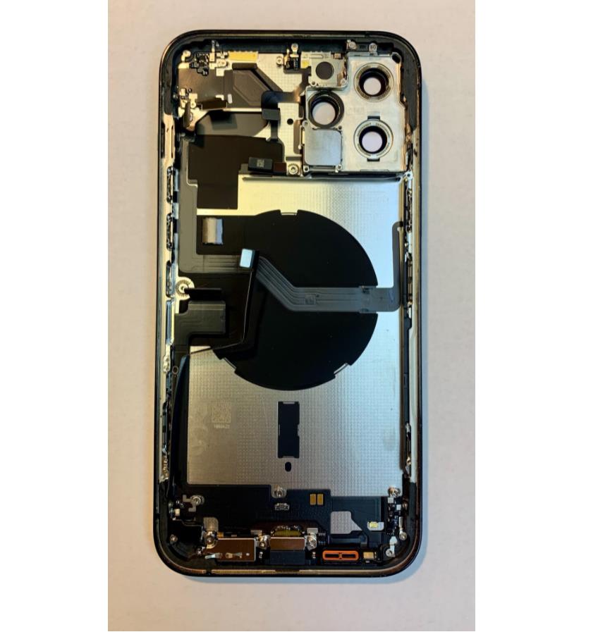 - iPhone 12 Pro Max Backcover Full Assembly - оригинален резервен заден капак заедно с Lightning порт, бутони за звука и вибрация, бутон за включване (on/off), лента за безжично зареждане, лидар скенер, светкавица и заден микрофон, антени за GPS, Bluetooth и WiFi, предпазните стъкла за камерите, сим трей