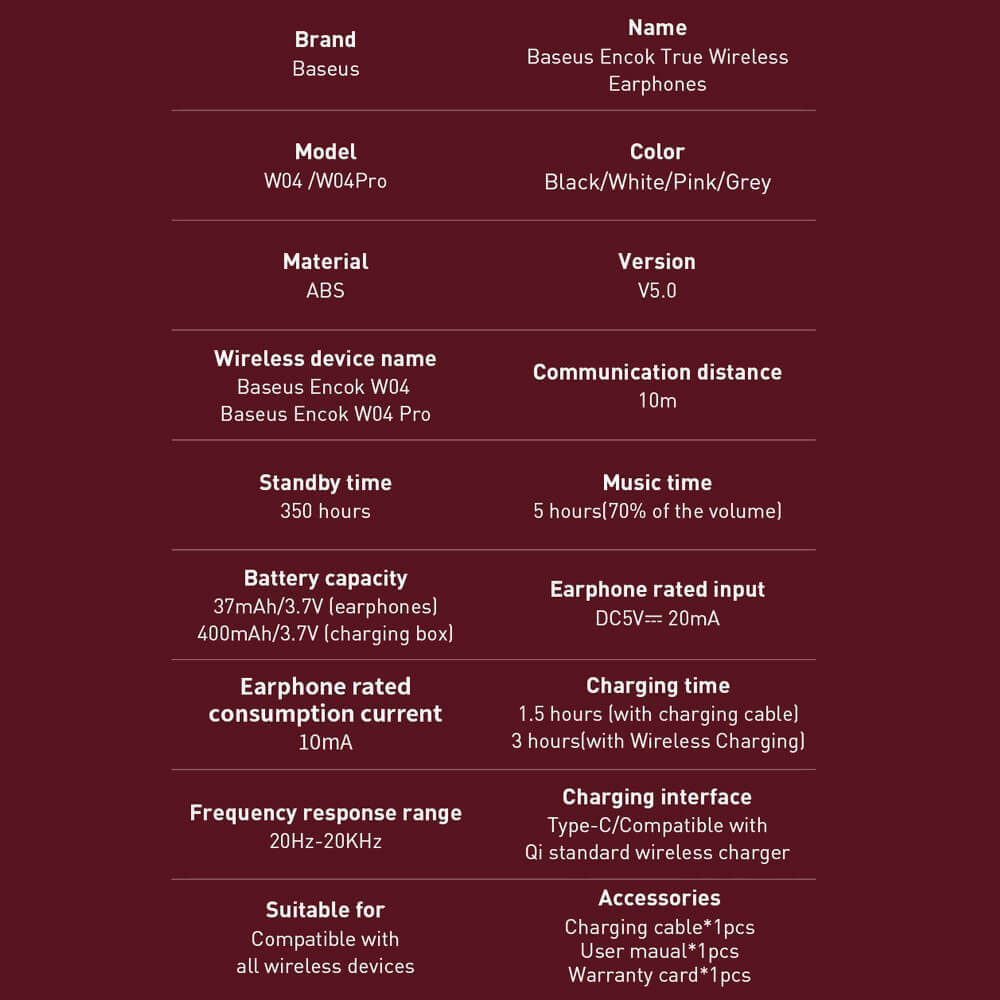 - 1 x Baseus Encok W04 Pro TWS In-Ear Bluetooth Earphones - 1 x USB-C кабел - 1 х ръководство