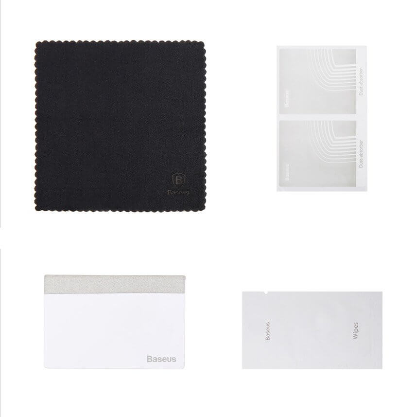 - 2 x Baseus Full Screem Curved Soft Screen Protector Anti Bluelight - 1 x микрофибърна кърпичка - 1 х мокра кърпичка - 2 х антистатична лепенка за премахване на прашинки