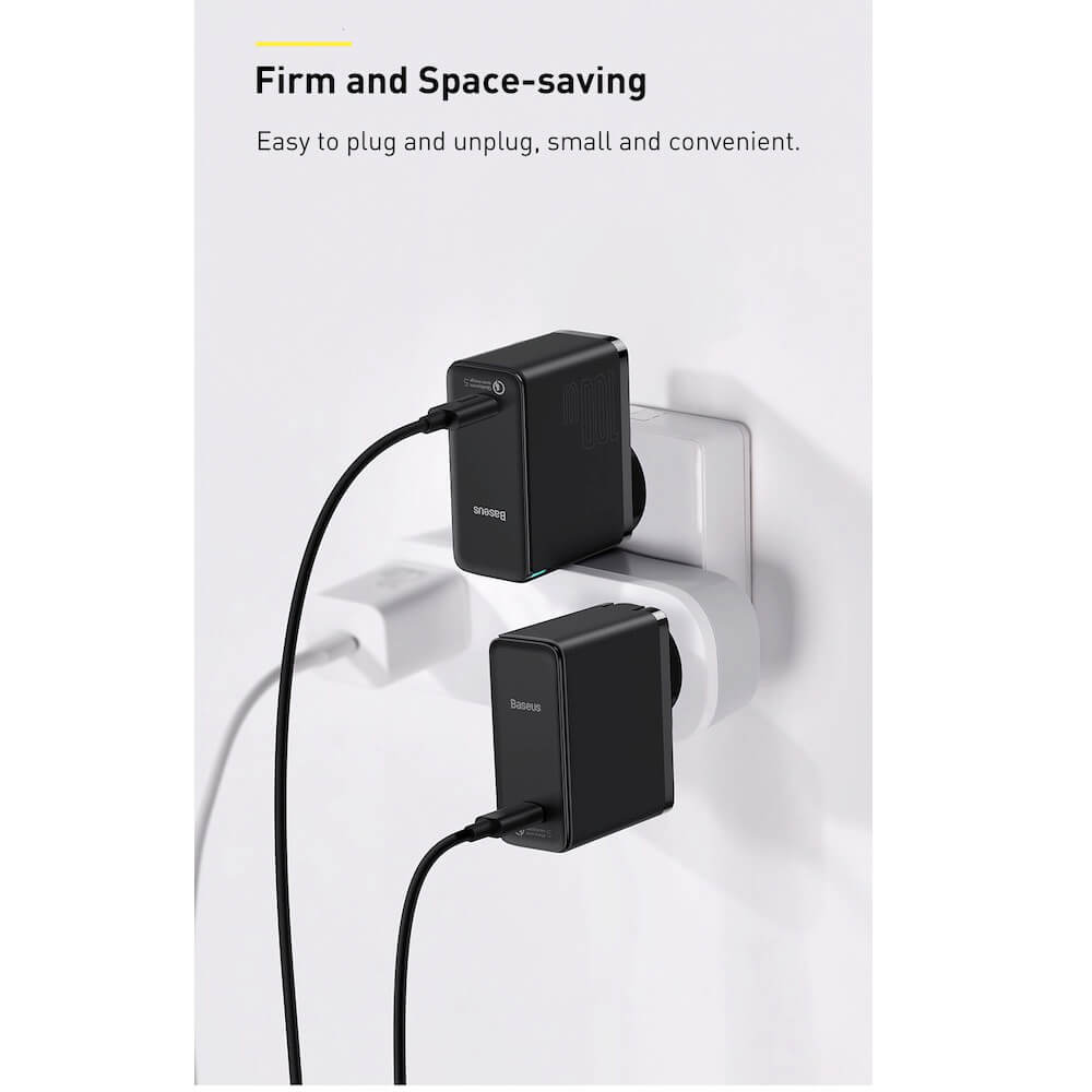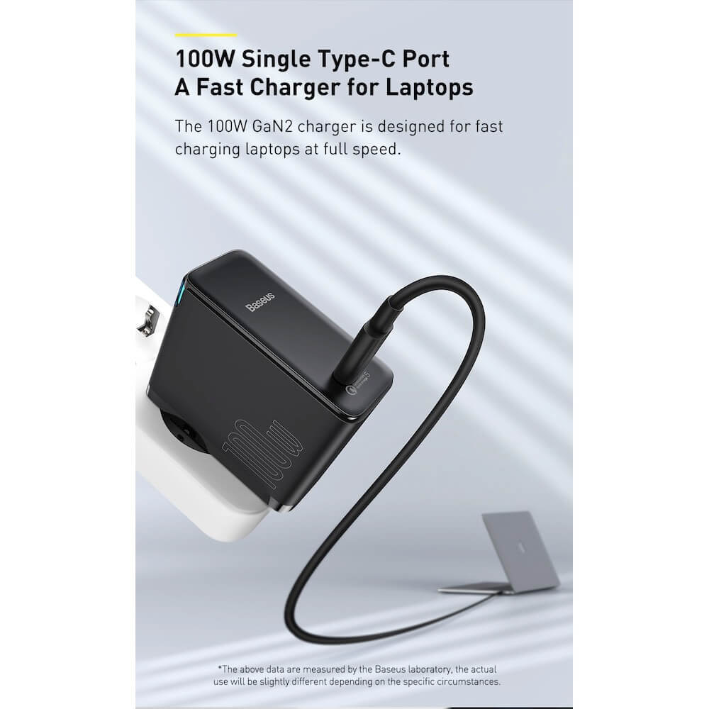 Baseus GaN 2 Fast Charger 1C 100W (TZCCGAN-L01) - захранване за ел. мрежа за лаптопи, смартфони и таблети с USB-C изход и технология за бързо зареждане и USB-C кабел (черен)