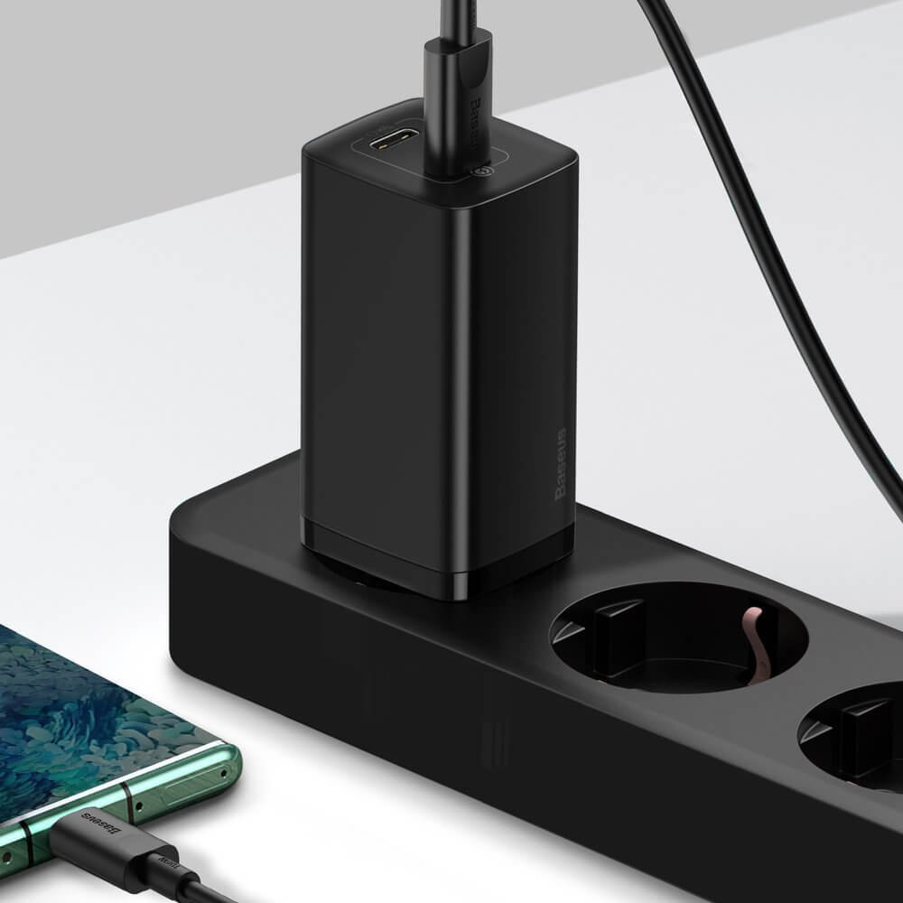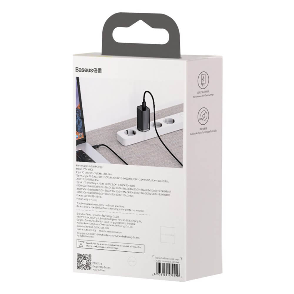 Baseus GaN 2 Lite Charger 65W (CCGAN2L-E01) - захранване за ел. мрежа за лаптопи, смартфони и таблети с 2xUSB-C изхода и с технология за бързо зареждане (черен)