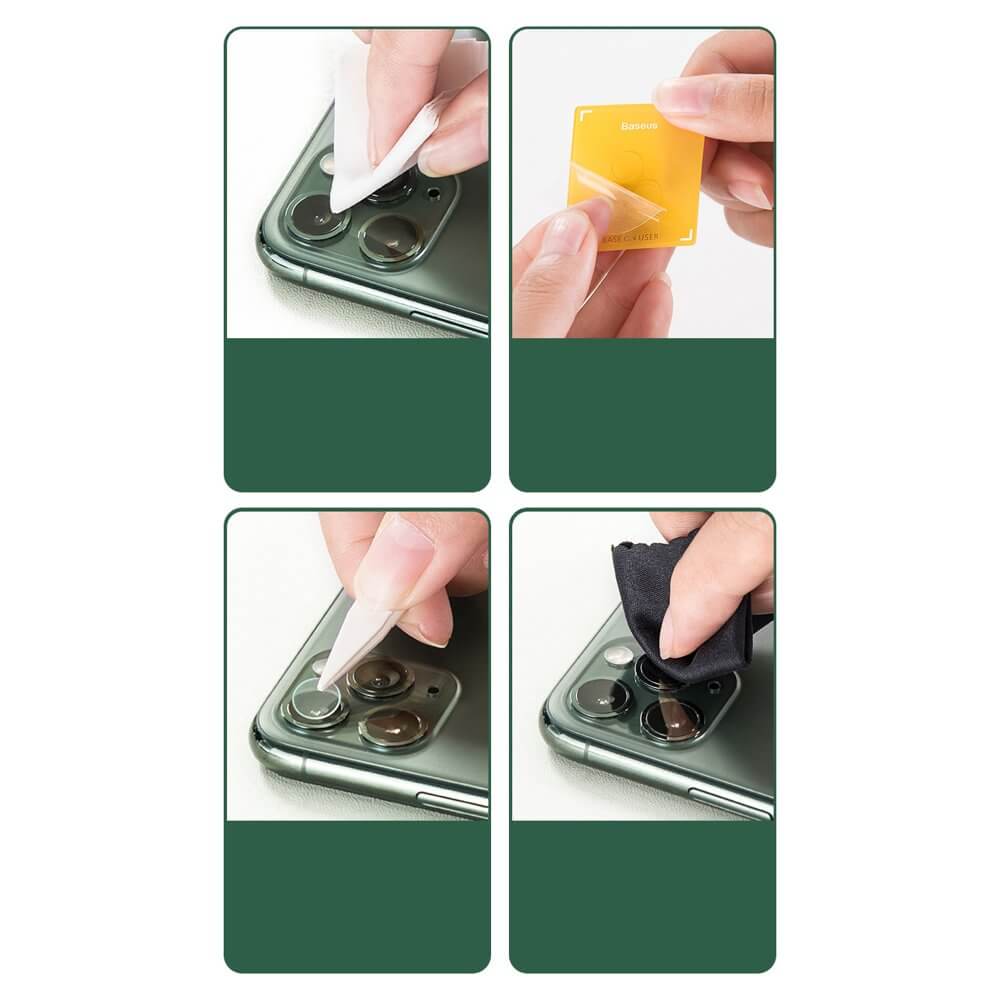 - 3 х Baseus Gem Lens Film - 1 x микрофибърна кърпичка - 1 х мокра кърпичка - 1 х пинсета за поставяне