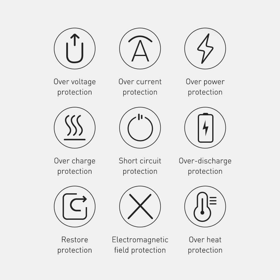 - Защити срещу: пренапрежение, свръхток, свръхмощност, претоварване, късо съединение, прекомерно разреждане, електромагнитно поле, прегряване