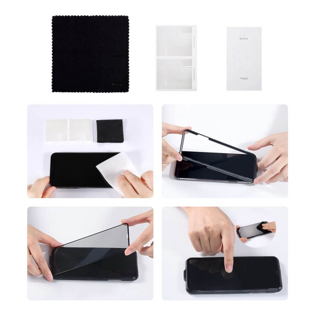- 2 х Baseus 3D Privacy Tempered Glass - 1 x микрофибърна кърпичка - 1 х мокра кърпичка - 1 х антистатична лепенка за премахване на прашинки