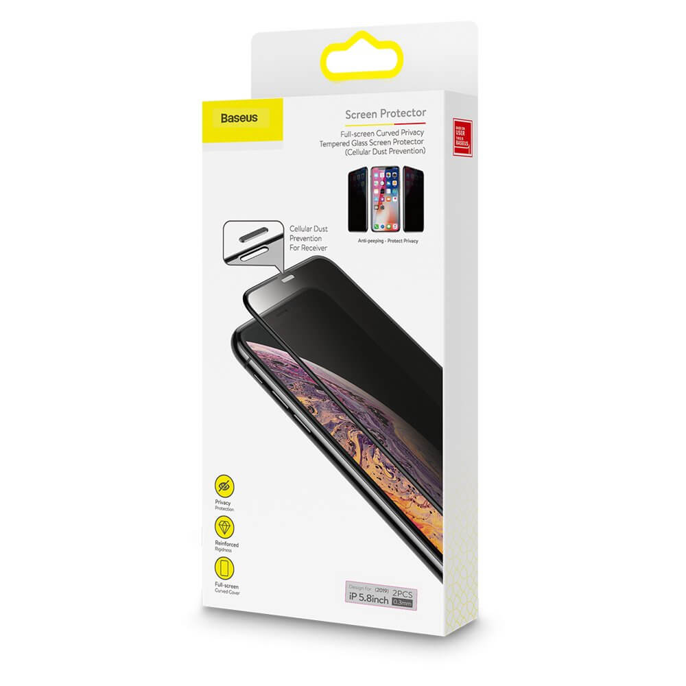 Baseus Privacy 3D Tempered Glass (0.30mm) - калено стъклено защитно покритие с извити ръбове и определен ъгъл на виждане за целия дисплей на iPhone 11 Pro, iPhone XS, iPhone X (черен-прозрачен) (два броя)