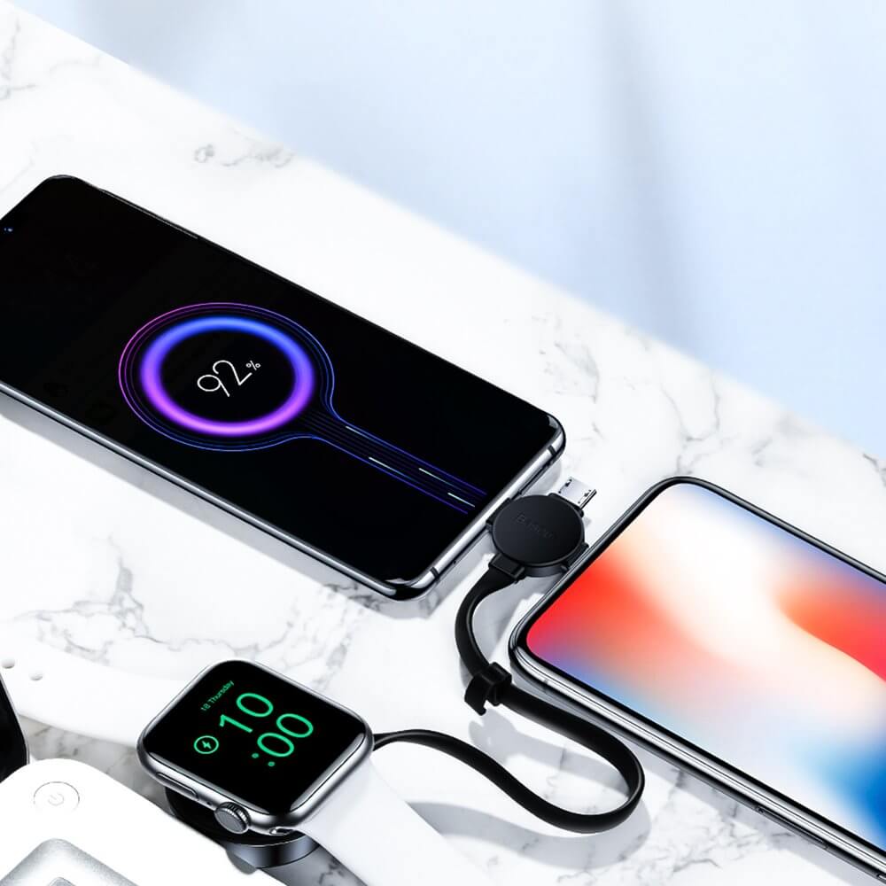 Baseus Star Ring 4-in1 USB Cable - универсален USB кабел с възможност за зареждане на Apple Watch, Lightning, microUSB и USB-C конектори (черен)