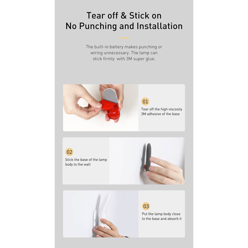 - Закрепването на лампата става чрез метална пластина с 3M залепящо фолио, която се прикрепя към стена или друга равна повърхност, а върху пластината, чрез магнит, се закрепя и самата лампа