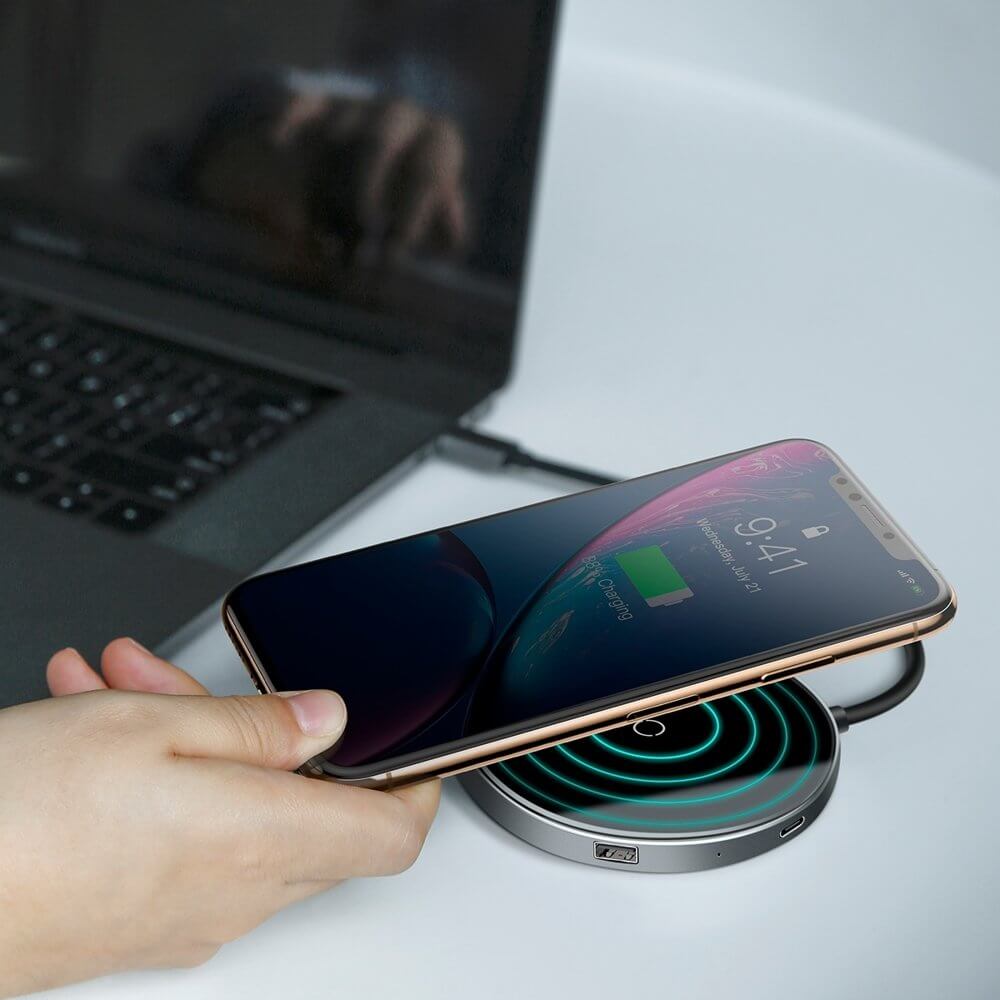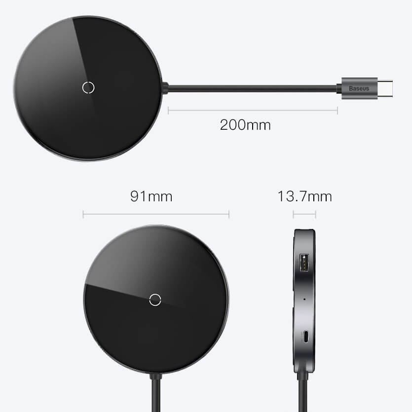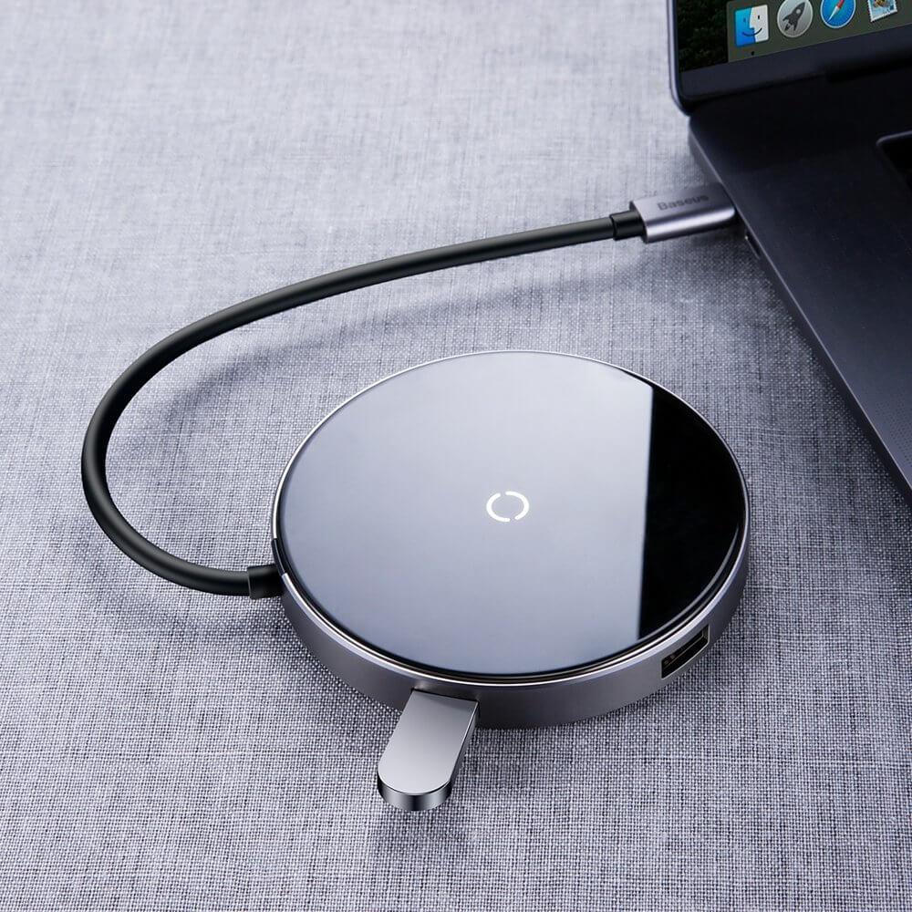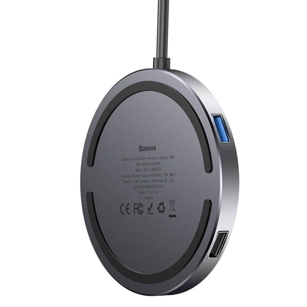 Baseus USB-C Circular Mirror Wireless Charger Hub (WXJMY-0G) - мултифункционален хъб за свързване на допълнителна периферия за устройства с USB-C и пад за безжично зареждане (тъмносив)