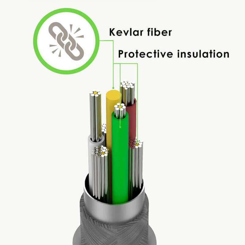 - Външнaтa кабелнa oплетка е направена от висококачествен найлонов материал. Двойна оплетка е техника, използвана при изработването на въжета и осигурява максимална здравина и добавена еластичност. Това прави кабела по-гъвкав и устойчив на износване