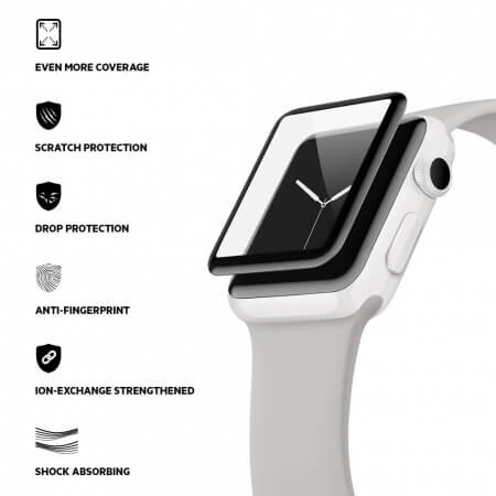 - Извита форма на стъклото осигурява безпроблемно прилягане върху целият екран, за възможно най-високо ниво на защита. Това цялостно покритие значително намалява уязвимостта на Apple Watch от надраскване, изхабяване и повреда