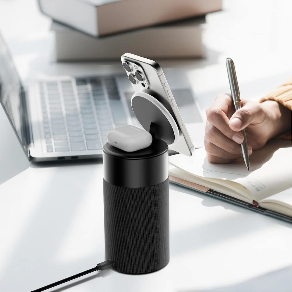 - Безжичен Bluetooth спийкър с максимална мощност 5W и вградена поставка (пад) за безжично зареждане на iPhone с MagSafe и AirPods. Това осигурява по-бързо зареждане и съвместимост с различни устройства.