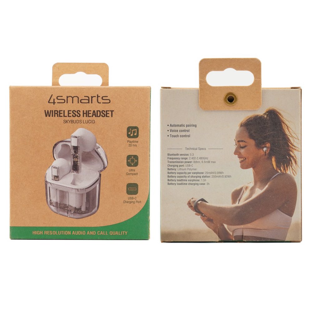 - В комплекта: 1 x 4smarts SkyBuds Lucid TWS In-Ear Bluetooth Earphones, 1 х кейс за съхранение и зареждане, 1 x USB-C към USB-A кабел (30 см), 1 х ръководство