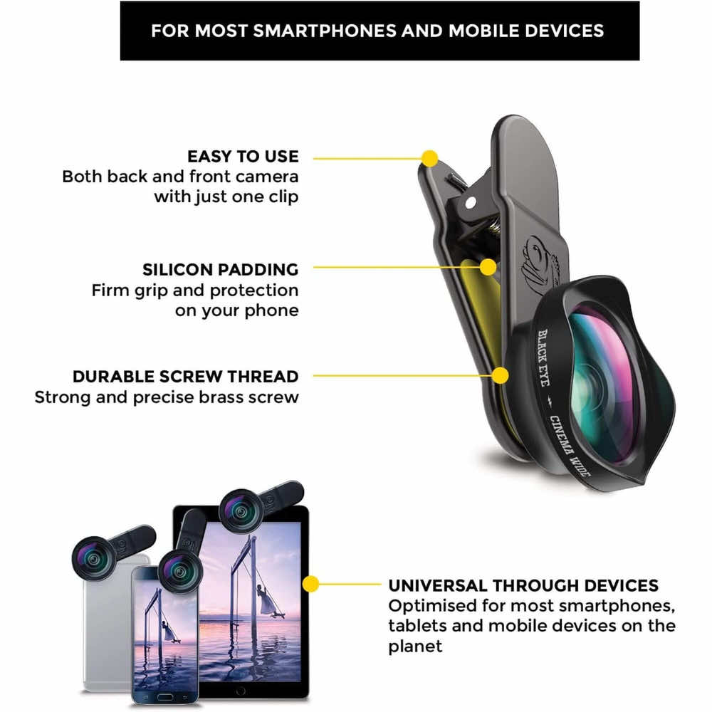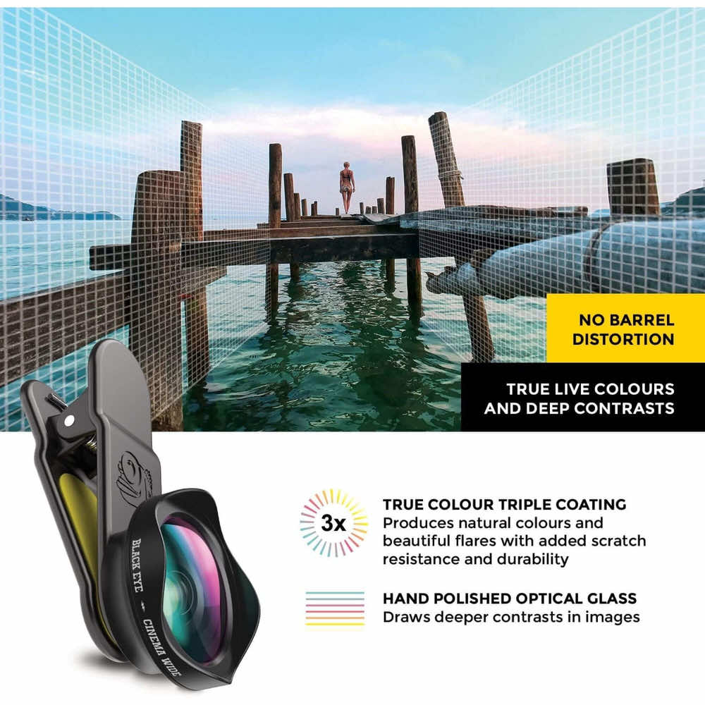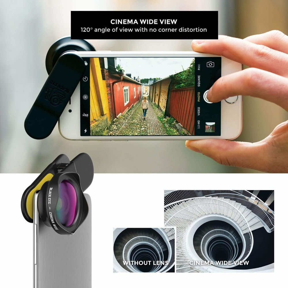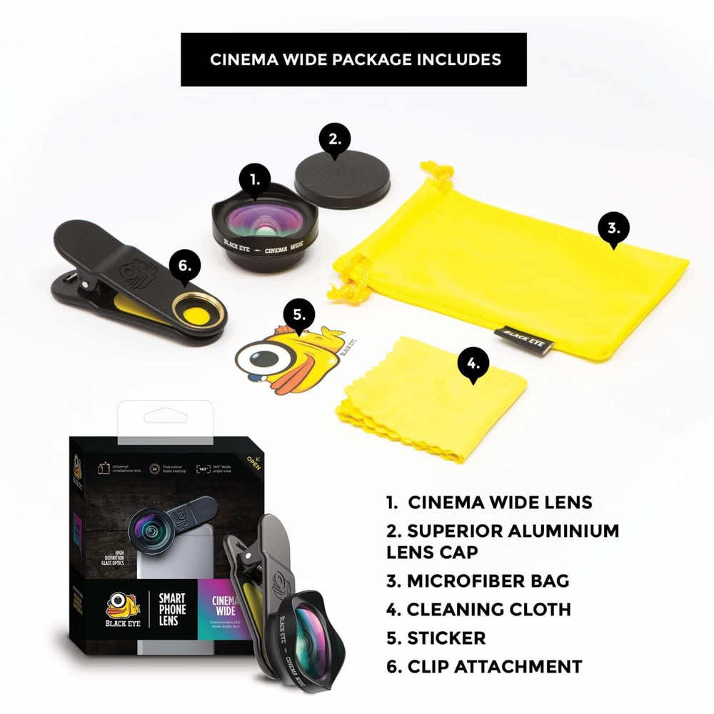 - 1 x Black Eye PRO Cinema Wide леща - 1 x Black Eye щипка - 1 x почистваща кърпичка - 1 x капачка за лещата - 1 x микрофибърна торбичка за съхранение