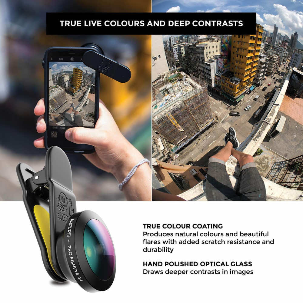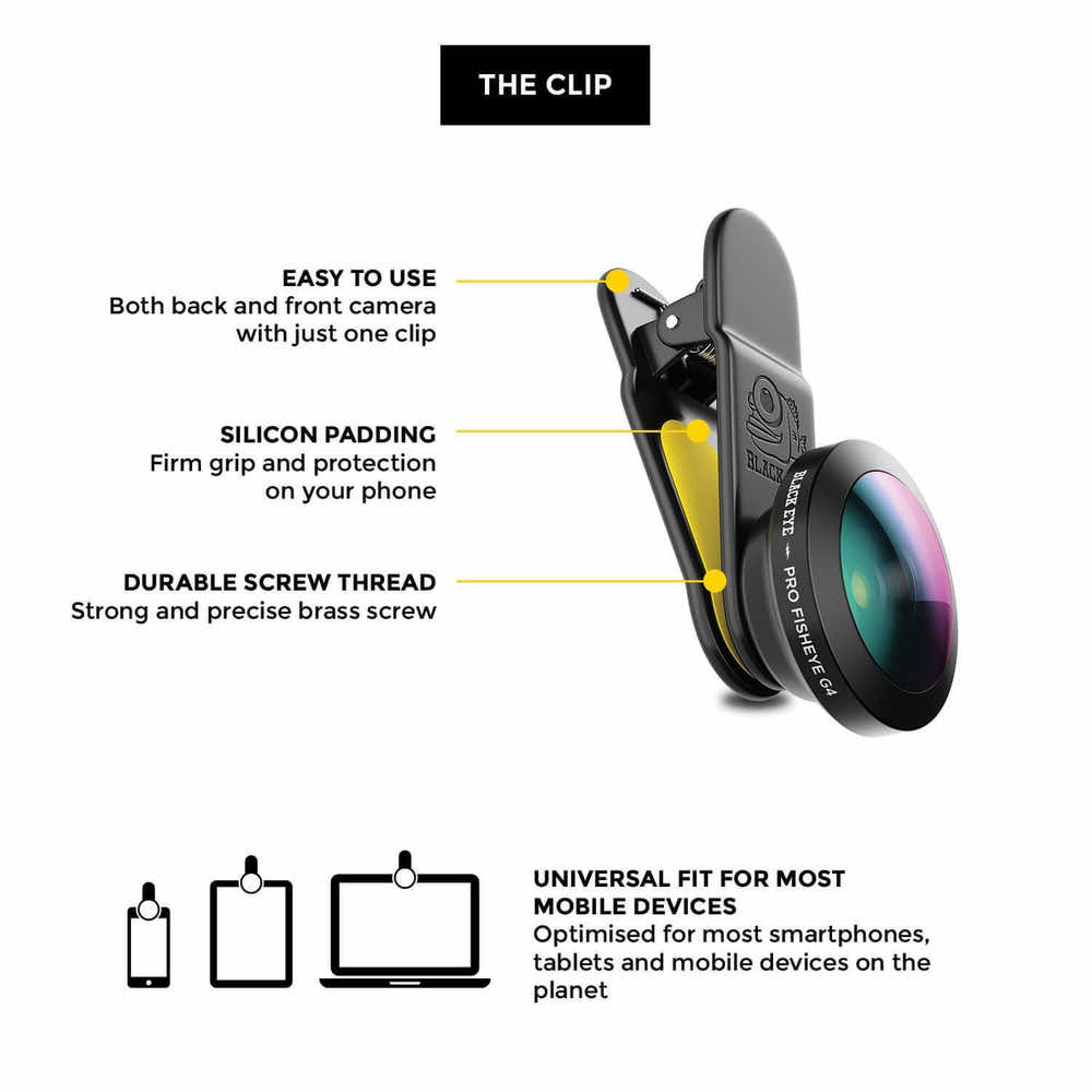 - 1 x Black Eye PRO Fish Eye G4 леща - 1 x Black Eye щипка - 1 x почистваща кърпичка - 1 x капачка за лещата - 1 x микрофибърна торбичка за съхранение