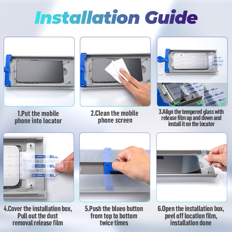 • Внимание: протекторът може да се премахне от дисплея и да се сложи наново, но това трябва да стане много внимателно. Ако е наложително използвайте антистатичната лепенка в комплекта, за да премахнете прашинките от стъкления протектор при повторното поставяне