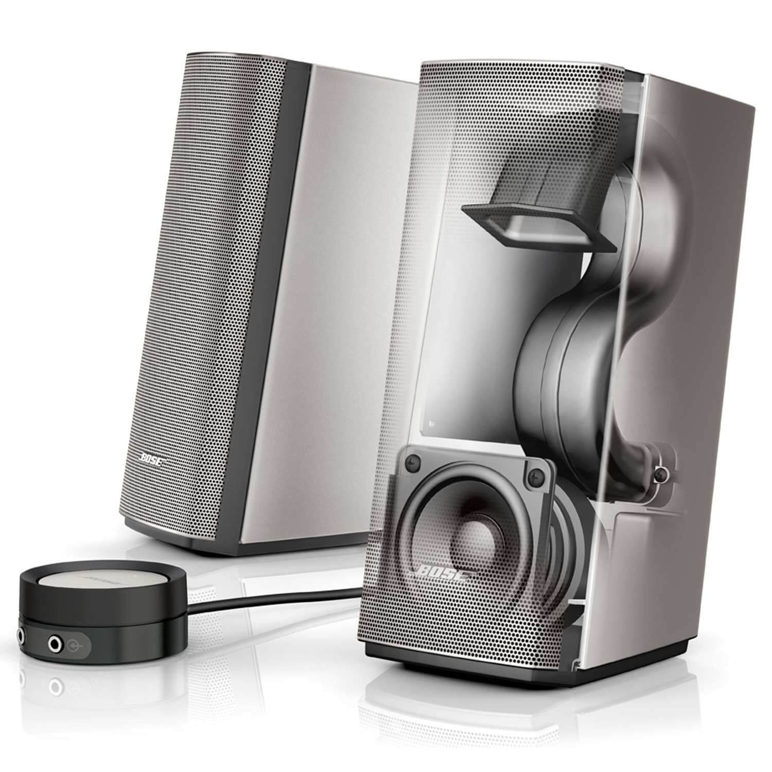 - Патентованата технология и усъвършенстваният дизай правят вашата музика, игри и видеоклипове да оживяват. И целият този звук се излива само от два високоговорителя - няма нужда от басов модул. С няколко бързи връзки можете да се насладите на богатството от съдържание на вашия компютър с богат звук от Bose