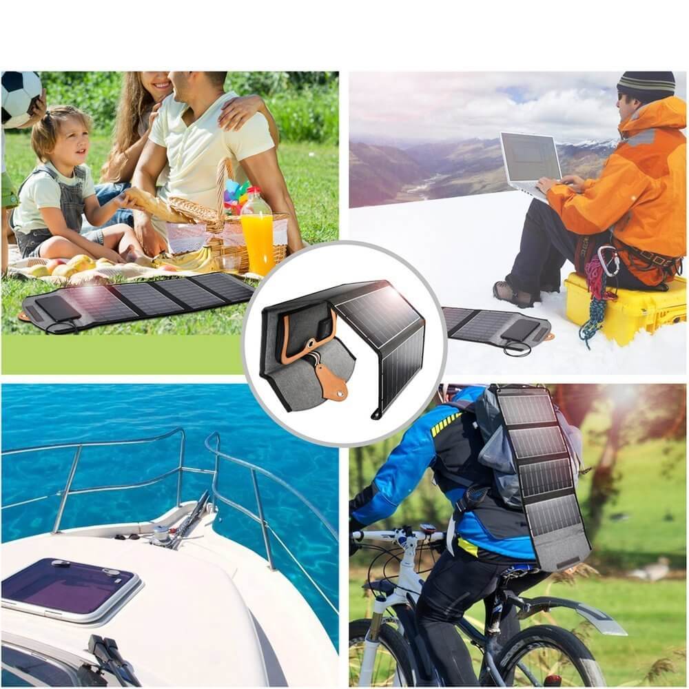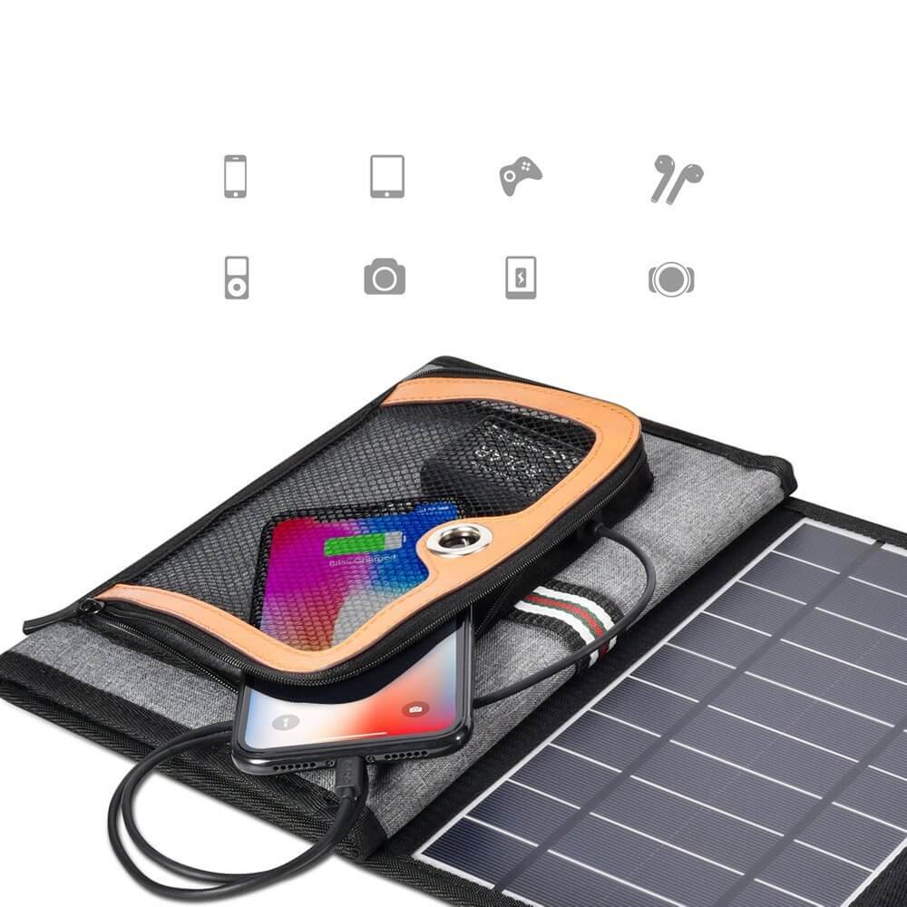 - Сгъаваем соларен панел с 2 USB-A порта, за зареждане на смартфон, камера или други USB устройства, директно от слънцето